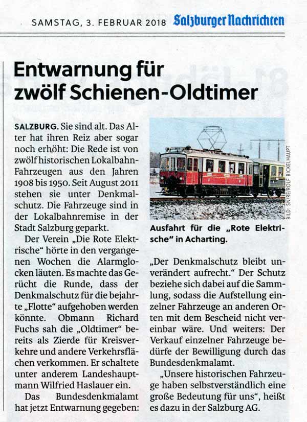 Der Verein „Die Rote Elektrische“ hat einen Hilferuf an den Landeshauptmann und an den Europäischen Dachverband der Tourismus und Nostalgiebahnen FEDEC-Rail gestartet. Zum Jahreswechsel stellte der Verein eine Anfrage an das Bundesdenkmalamt, ob so ein Antrag auf Aufhebung des Denkmalschutzes durch die Salzburg AG gestellt wurde. In einem Telefonat und in einem Brief des Bundesdenkmalamtes an unseren Verein wurde ganz klar bestätigt, dass der „Ensembleschutz“ (Sammlung darf auch in Teilen nicht aufgelöst werden) der zwölf historischen Fahrzeuge nie in Frage stand und auch in Zukunft nicht stehen wird. Der Bescheid vom 30.8.2011 und der Brief [siehe Beilage] vom 18.1.2018 sind eindeutige Beweise für den Fortbestand des Denkmalschutzes der 12 historischen Lokalbahnfahrzeuge.