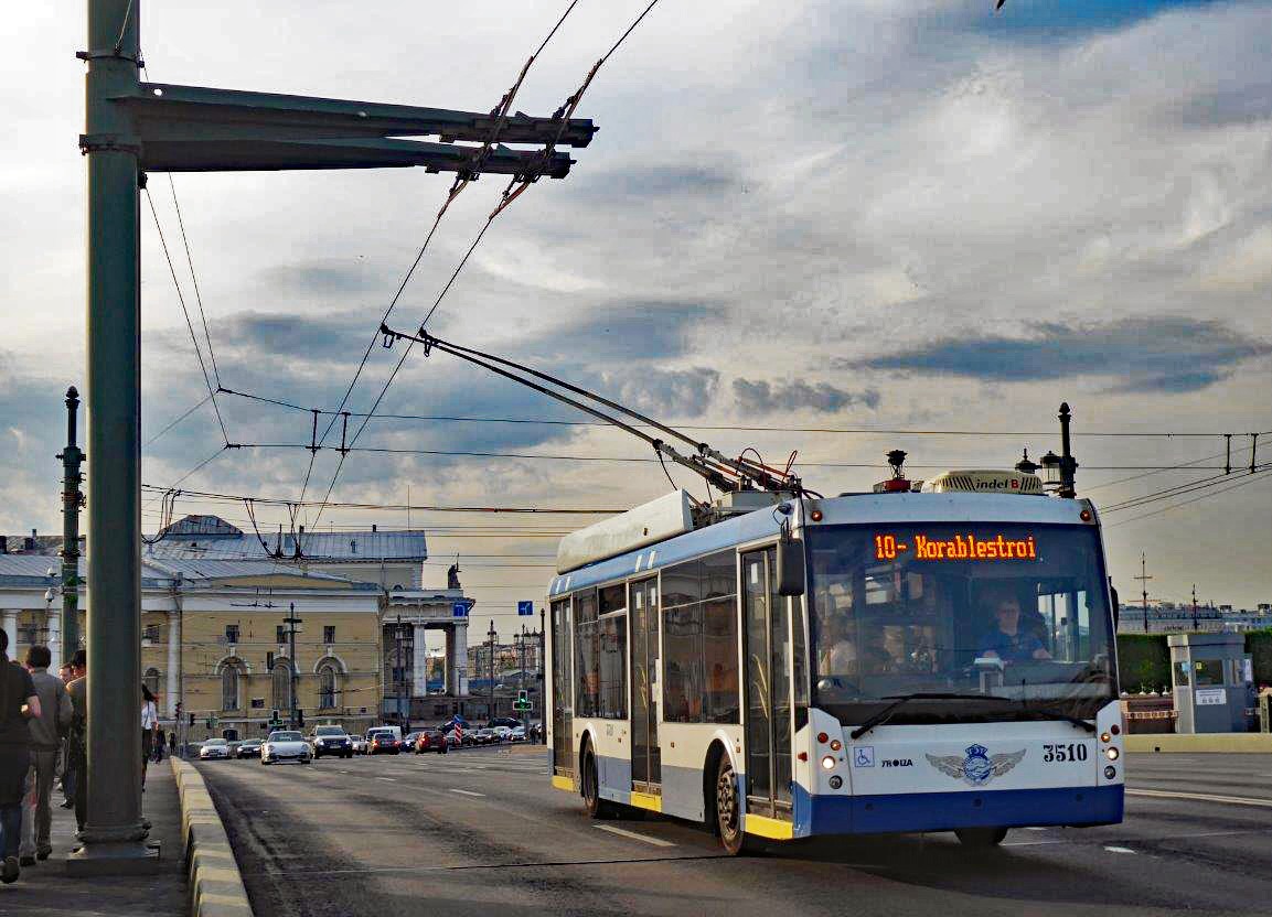 St. Petersburg, Oberleitungsbus 3510 (Trolza / 2013) auf Linie 10 auch auf der Dvortsovyy-Brücke, mit spezieller Überkopfverengung zum Anheben der Brückenkonstruktion.