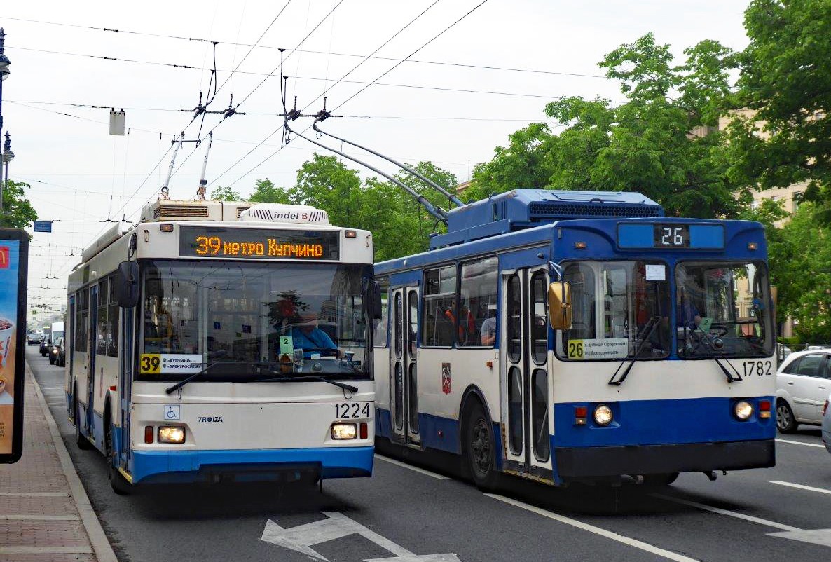 St. Petersburg Obusse, Emsiger Obusverkehr, 1782 (MTrZ / 1986/2011) auf der Linie 26 fährt an der Linie 39 in der Ligorsky Ave. 1224 (Trolza / 2012) vorbei.