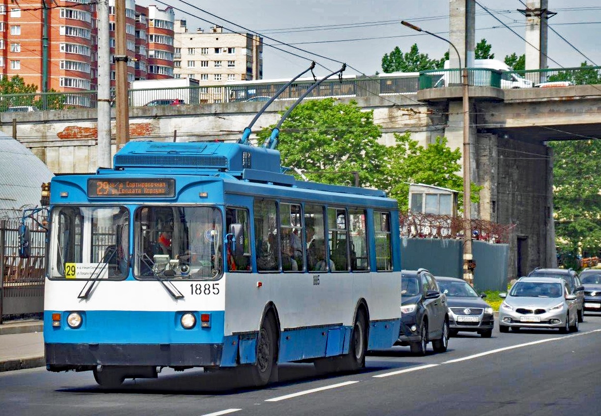 St. Petersburg Obusse, Oberleitungsbus 1885 (Baujahr 1985 MTrZ 6223; Umbau 2011 durch das Moskauer Oberleitungsbuswerk) auf der Linie 29 in Frunsenski Rajon.