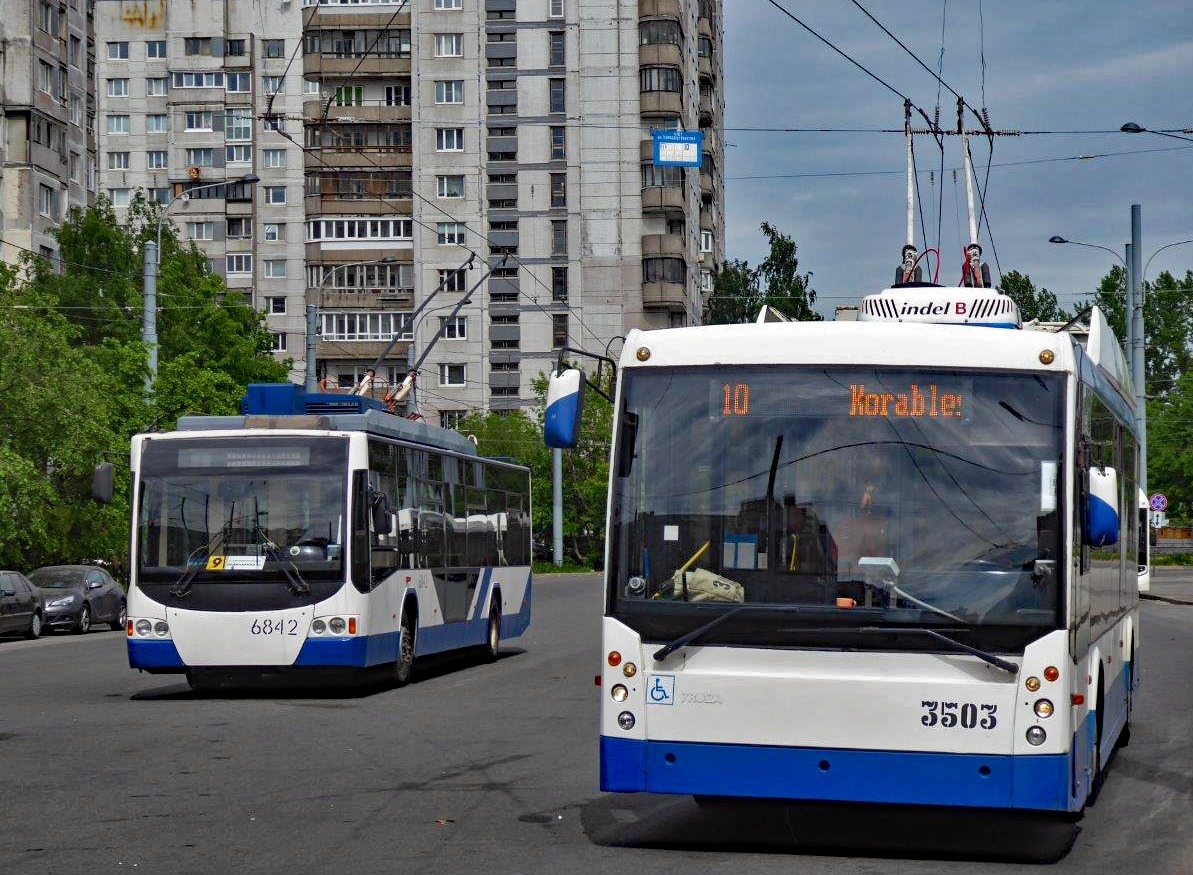 St. Petersburg Obusse, Oberleitungsbus 3503 (Trolza / 2013) auf der Linie 10 neben 6842 (Trans-Alpha) / 2012) auf der Linie 9 am Endpunkt der Straße Korablestroiteley.