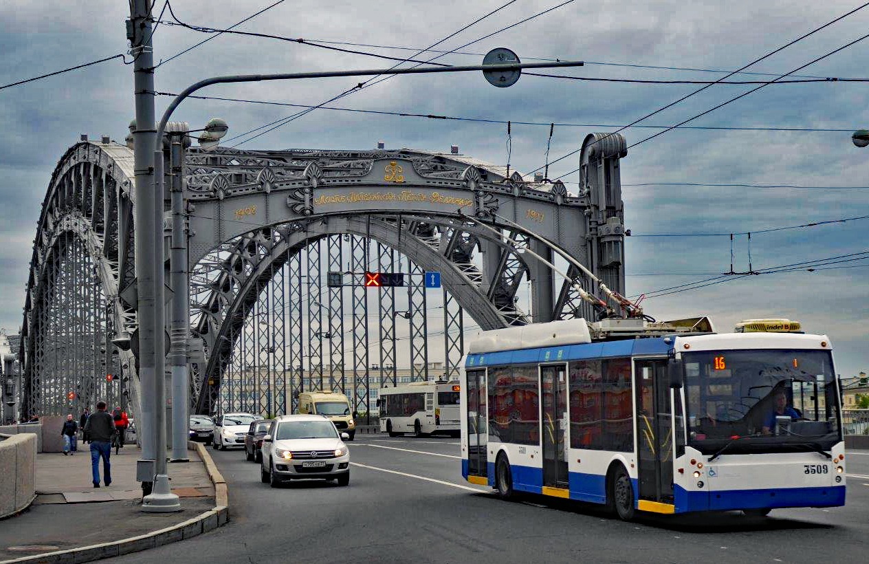 St. Petersburg Obusse, Trolleybus 3509 (Trolza / 2013) verlässt die Bolsheohtinskiy-Brücke auf der Linie 16.