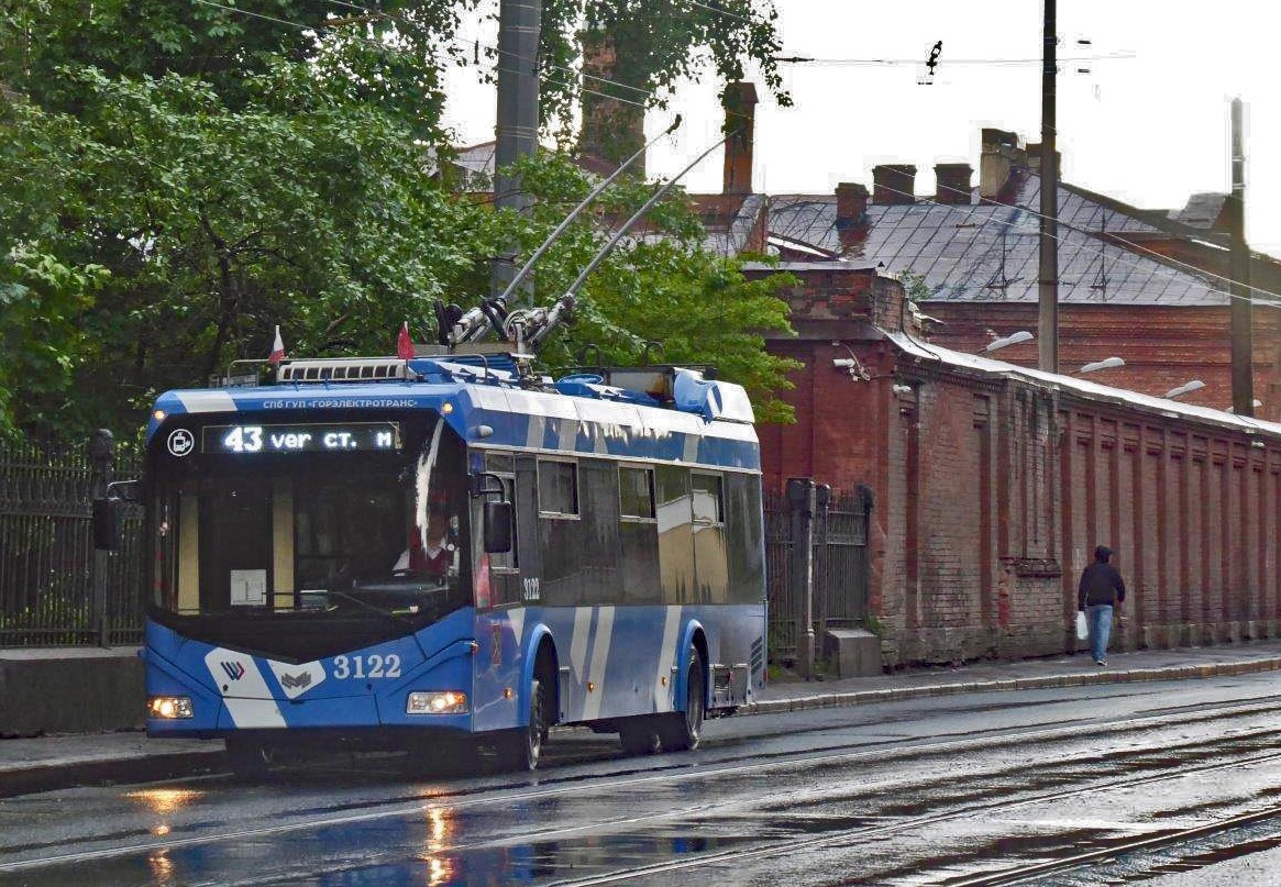 St. Petersburg Obusse, Oberleitungsbus 3122 (BKM / 2017) auf 43, unterwegs bei starkem Regen.
