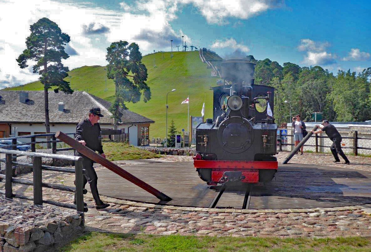 Ventpils/Windau - 600mm Paradies in Kurzeme Lettland, Am neuen Endpunkt „Kalns“ am Freizeitpark wird die Lok mittels händischer Drehscheibe gewendet.