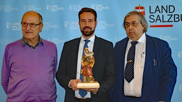 Für den Verein „Die Rote Elektrische“ überreichen Obmann Richard Fuchs und Schriftführer DI (FH) Erwin Pamp die Barbarastatue am 4.2.2020 an Landesrat Mag. Stefan Schnöll in seinem Büro für den endgültigen Aufstellungsort in der unterirdischen Regionalstadtbahnstation „Mirabell“.