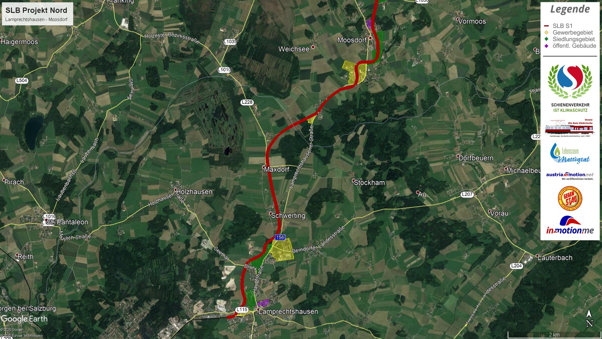 Trassenführung der vorgeschlagenen Strecke zwischen Ranshofen und Lamprechtshausen.