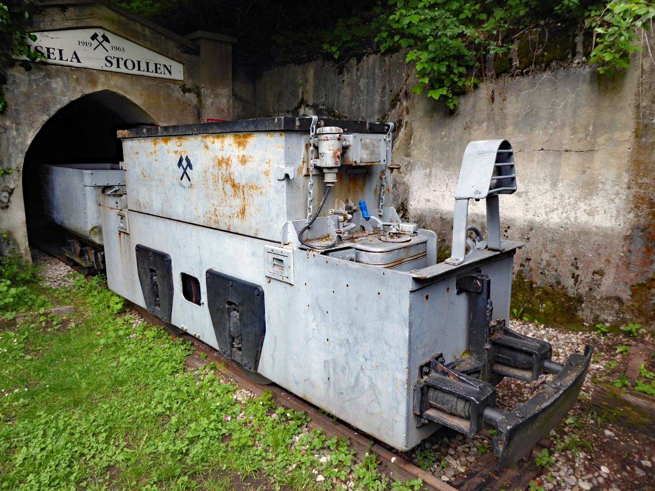 Kohlenbahn-Bahnhof Scheiben , Die Akkulok vom Typ GA1 (AEG/1949) erinnert am Mundloch des Giselastollens in Geboltskirchen an die seinerzeitigen Grubenbahnen.