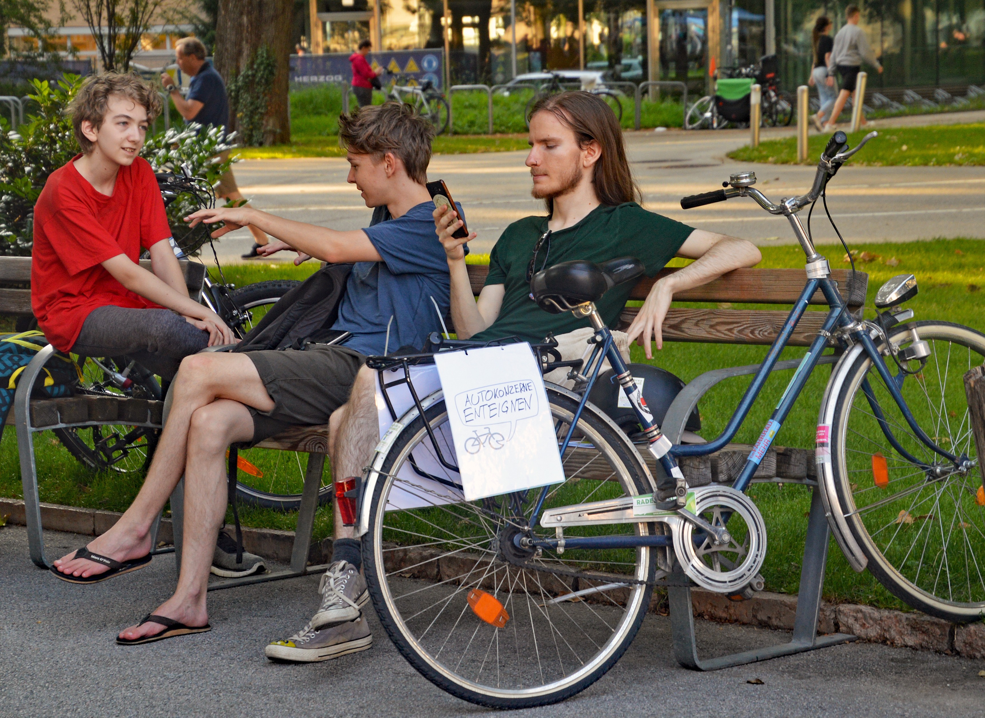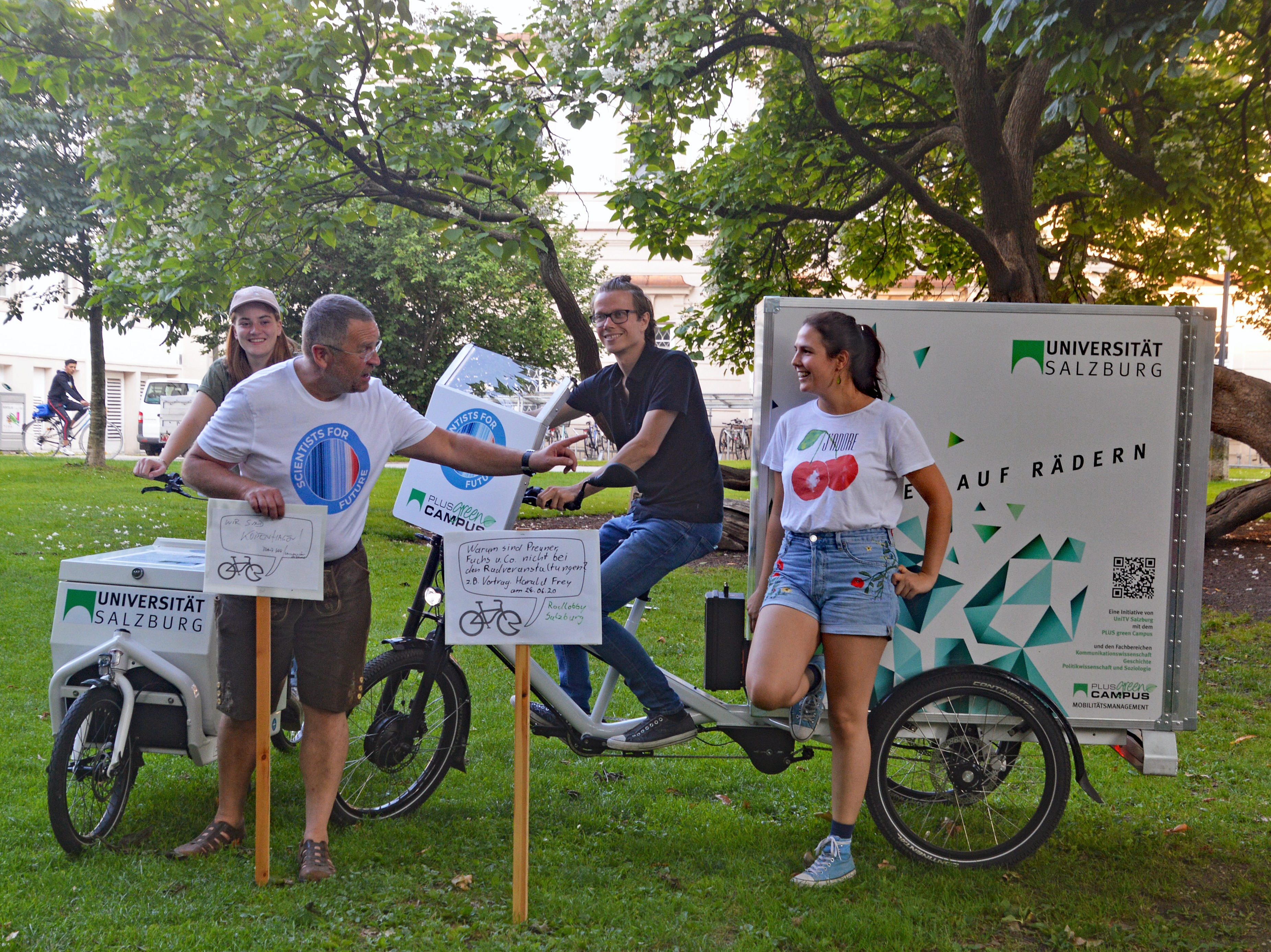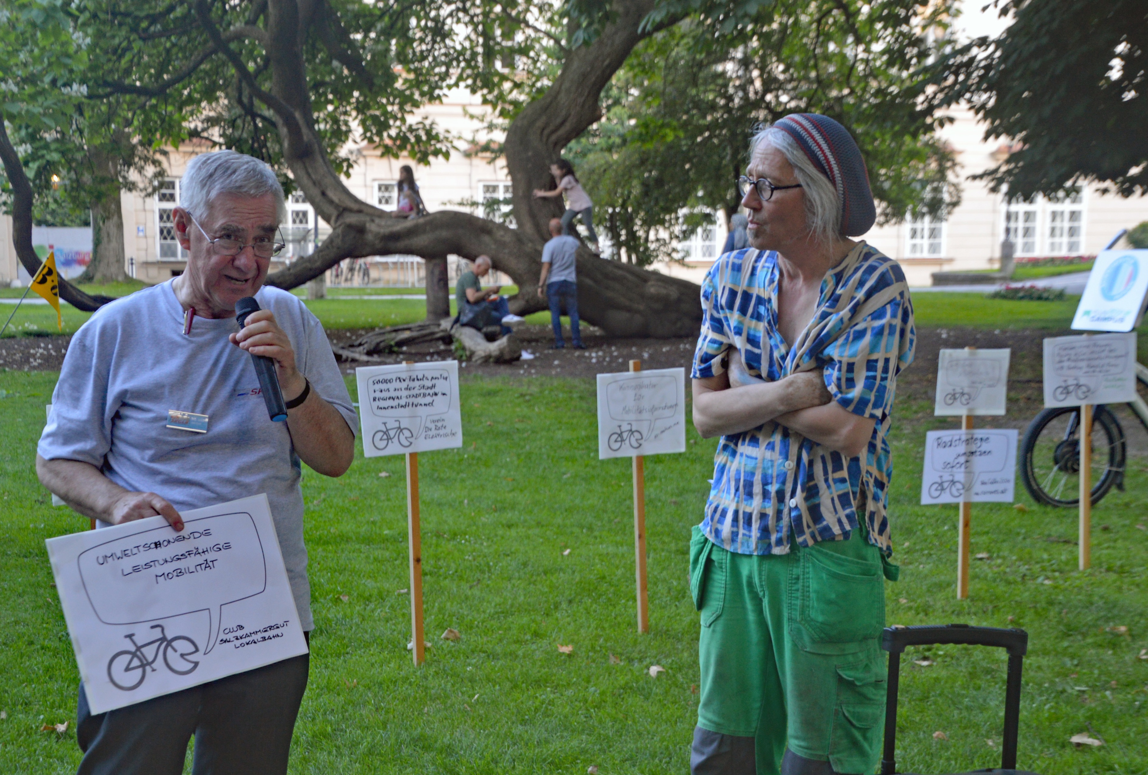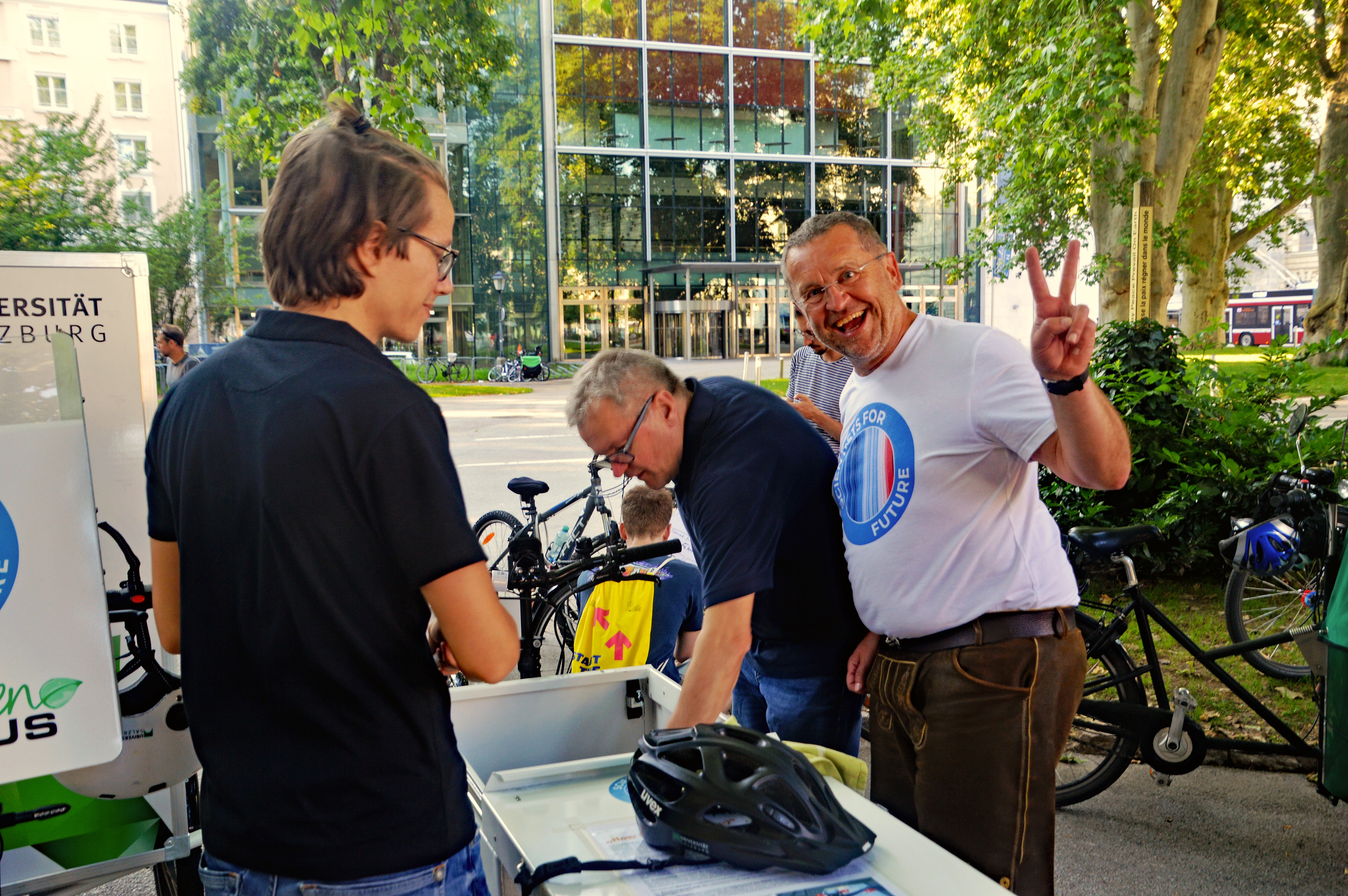 Weit über 100 Radfahrer drehten ihre Runden, um dann ab 18 Uhr mit Radlglocken, Musik und Abgeben von Statements der Initiativen übers Mikrofon und auf vorbereiteten Tafeln, in den Kurpark zu kommen. Die Mobilitätsgruppe der Uni Salzburg, unter Franz Kok, beeindruckte mit Spezial-Lastenfahrrädern und stellte sich stolz den Fotografen. Eine kleine und junge Gruppe von „Fridays for Future“ warb für die nächste Demo am 3. Juli 2020. Auch Car-Sharing war mit der früheren grünen Abgeordneten Angela Lindner präsent.