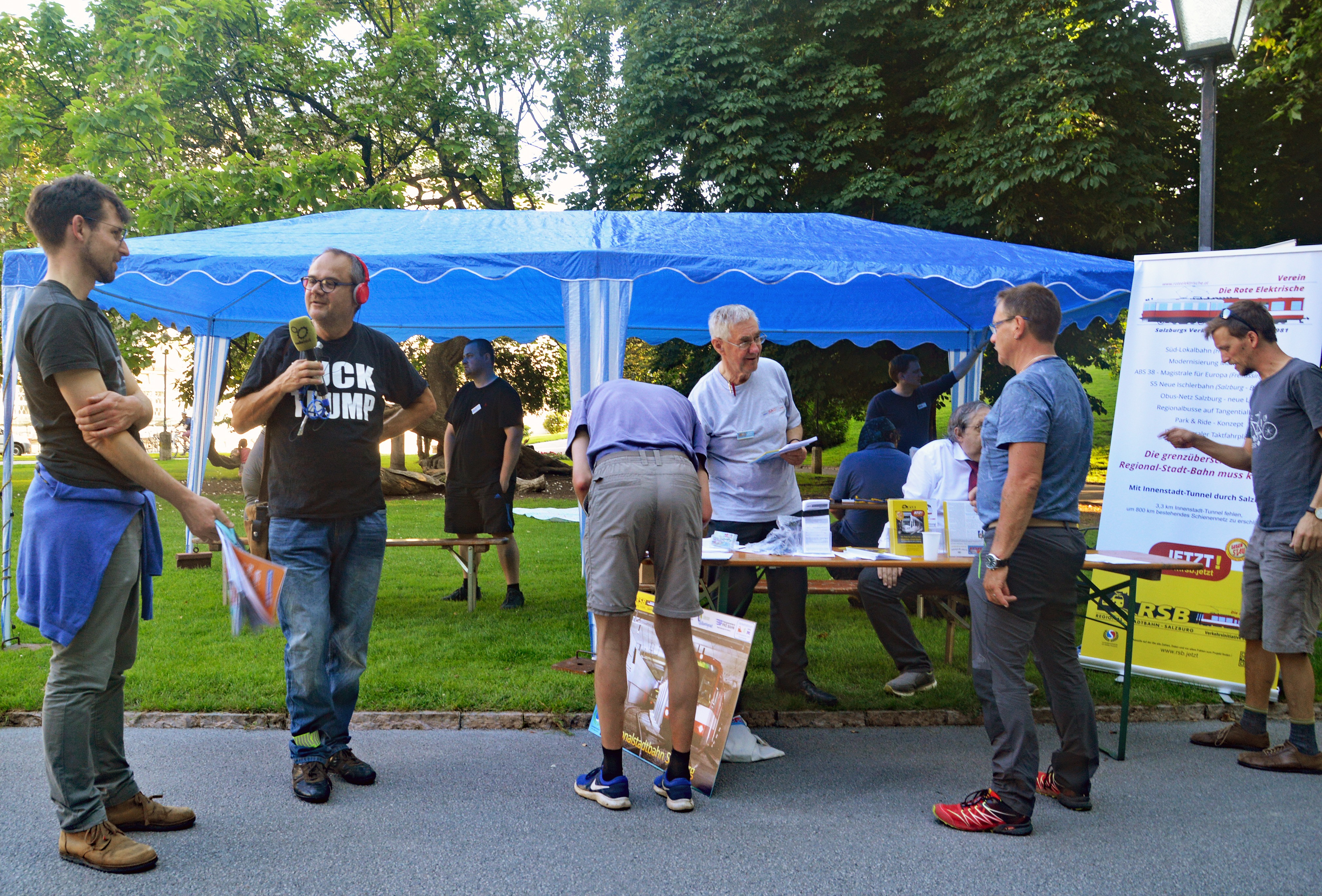 Das windstille und warme Sommerwetter ermöglichte ein gelungenes Initiativenfest mit Musik bis in den späten Abend. Der Organisator Rio Mäuerle zeigte sich sichtlich zufrieden, ebenso, wie der Bürgerlisten-Gemeinderat Lukas Uitz. Das Zelt der ÖPNV-Initiativen des Vereines „Die Rote Elektrische“ war der beliebte Treff auch der „Radlobby“ (vorm. VeloClub), von Dr. Fidelius Krammel, und vieler Radinitiativlern. Von den Schieneninitiativen ergriffen folgende Herren das Mikrofon: Richard Fuchs vom Verein „Die Rote Elektrische“, Sepp Weiser vom Club SKGLB, Gregor Watzl für In-Motion.Me, sowie als Vertreter des Verkehrsforums Berchtesgadener Land und Rupertiwinkel Martin Schön. „Geschichtsunterricht“ gab es über die alte Ischlerbahn von Vereinsobmann Günther Gritsch vom Club Salzkammergutlokalbahn.