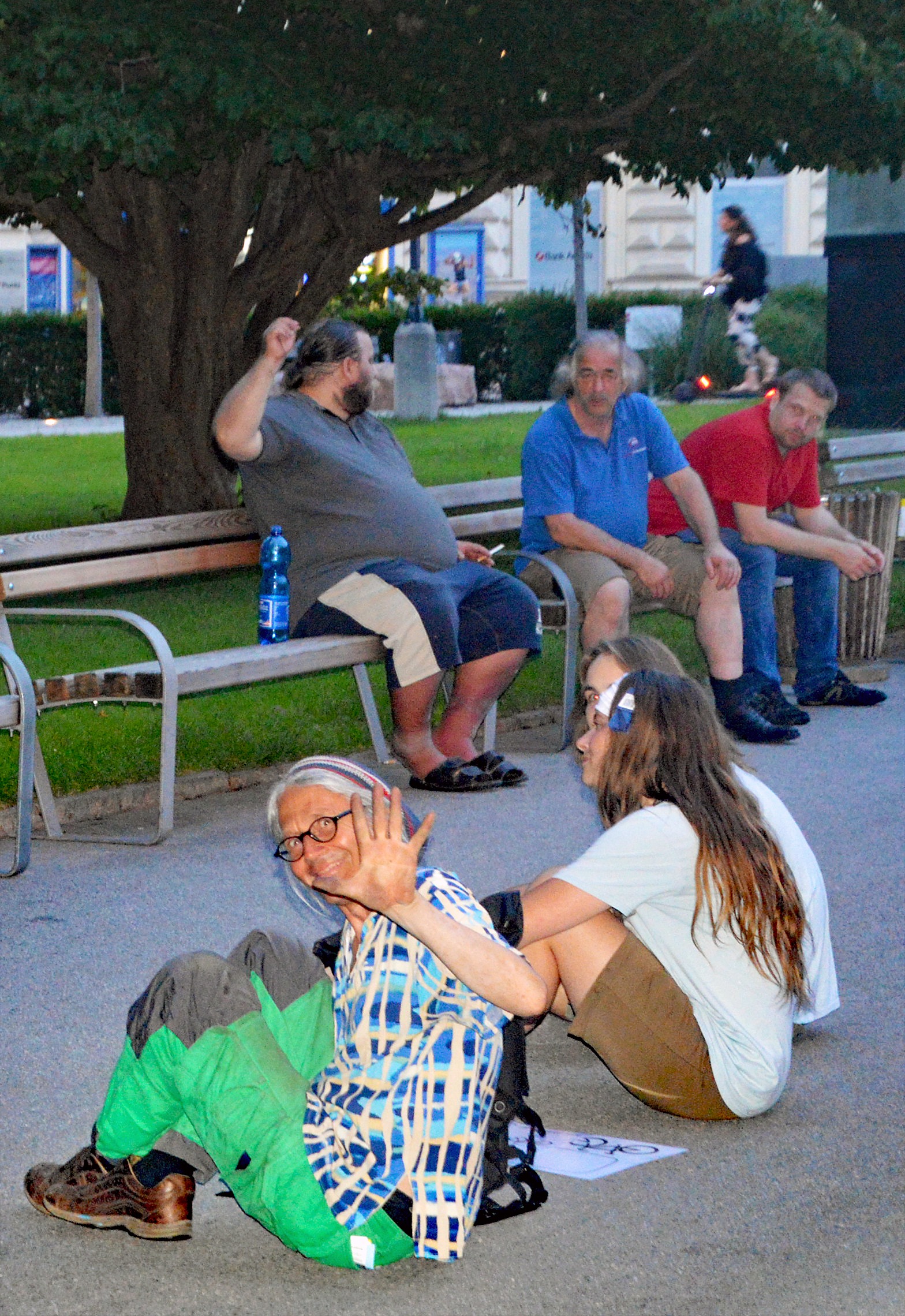 Bahn & Bus, Rad & Fuß im Kurpark, Initiativentreffen von "Critical Mass" freitags im Kurpark zwischen Kongresshaus und Schloß Mirabell. Übers Mikrofon konnten die Verkehrsinitiativen ihre Ziele vorstellen, wie hier "Die Rote Elektrische".