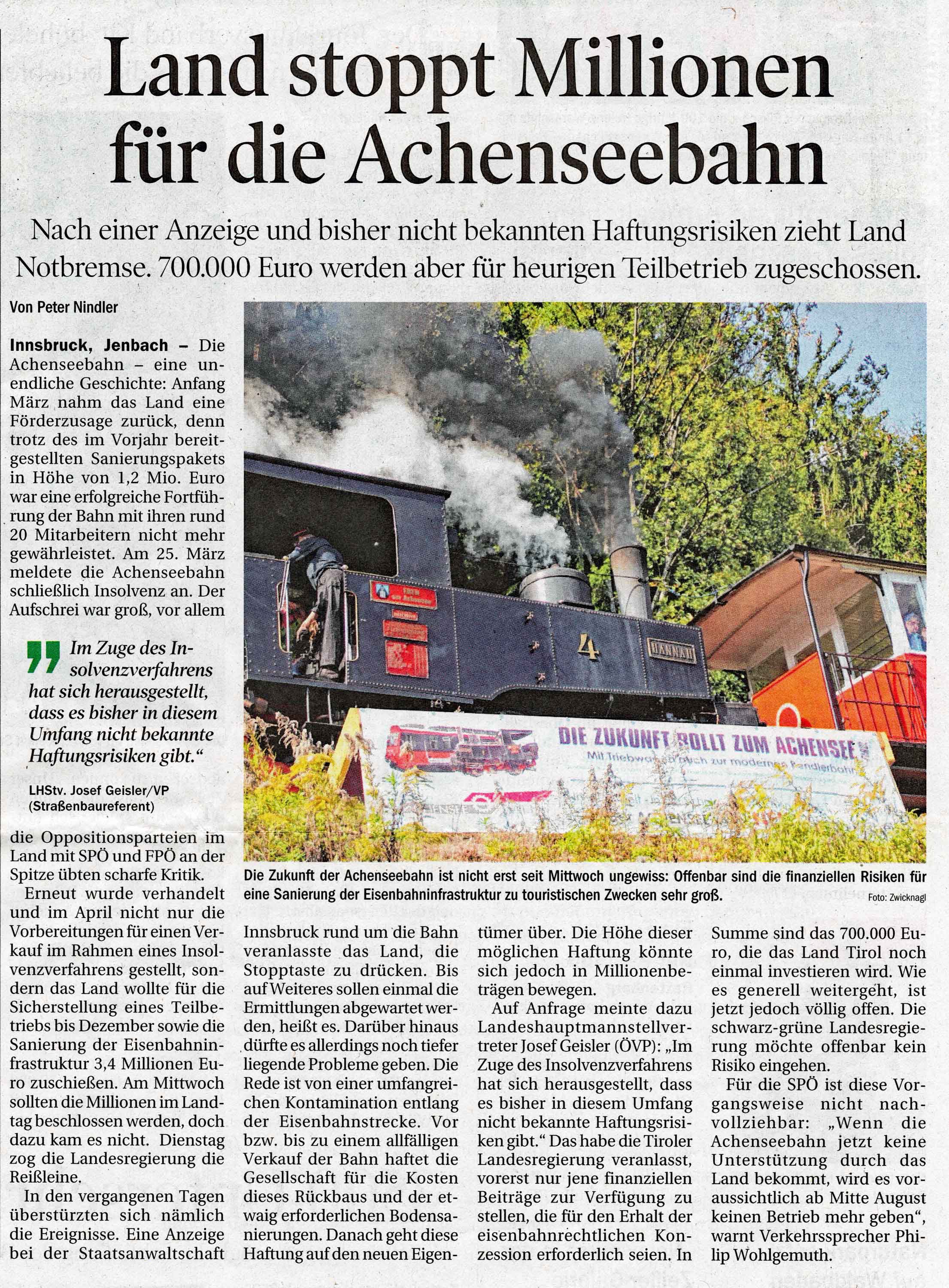 Herr Geisler argumentiert die Verweigerung der Mittel an die Achenseebahn mit politischer Verantwortung. Wo bitte war diese Verantwortung bei der Rad-WM mit einem Minus von mindestens 14 Millionen Euro, die nordische WM in Seefeld mit einem Verlust von mindestens 2 Millionen. Das skandalöse und meiner Meinung nach kriminelle Handel der Politik in Sachen TSD hat dem Steuerzahler mindestens 20 Millionen Euro gekostet. Als beim Vermarktungszentrum Rotholz eine Photovoltaik-Anlage aus China installiert wurde, obwohl ein Tiroler Betrieb in ca. 1 km-Entfernung besteht, argumentierte Geisler, daß auf Kosten geachtet werden müsse. Eine solche Frechheit hätte schon damals zur Entfernung von Geisler aus der Politik führen müssen. Wenn ein bißchen recherchiert würde, könnten sicher noch einige solcher „Missetaten“ aufgedeckt werden.