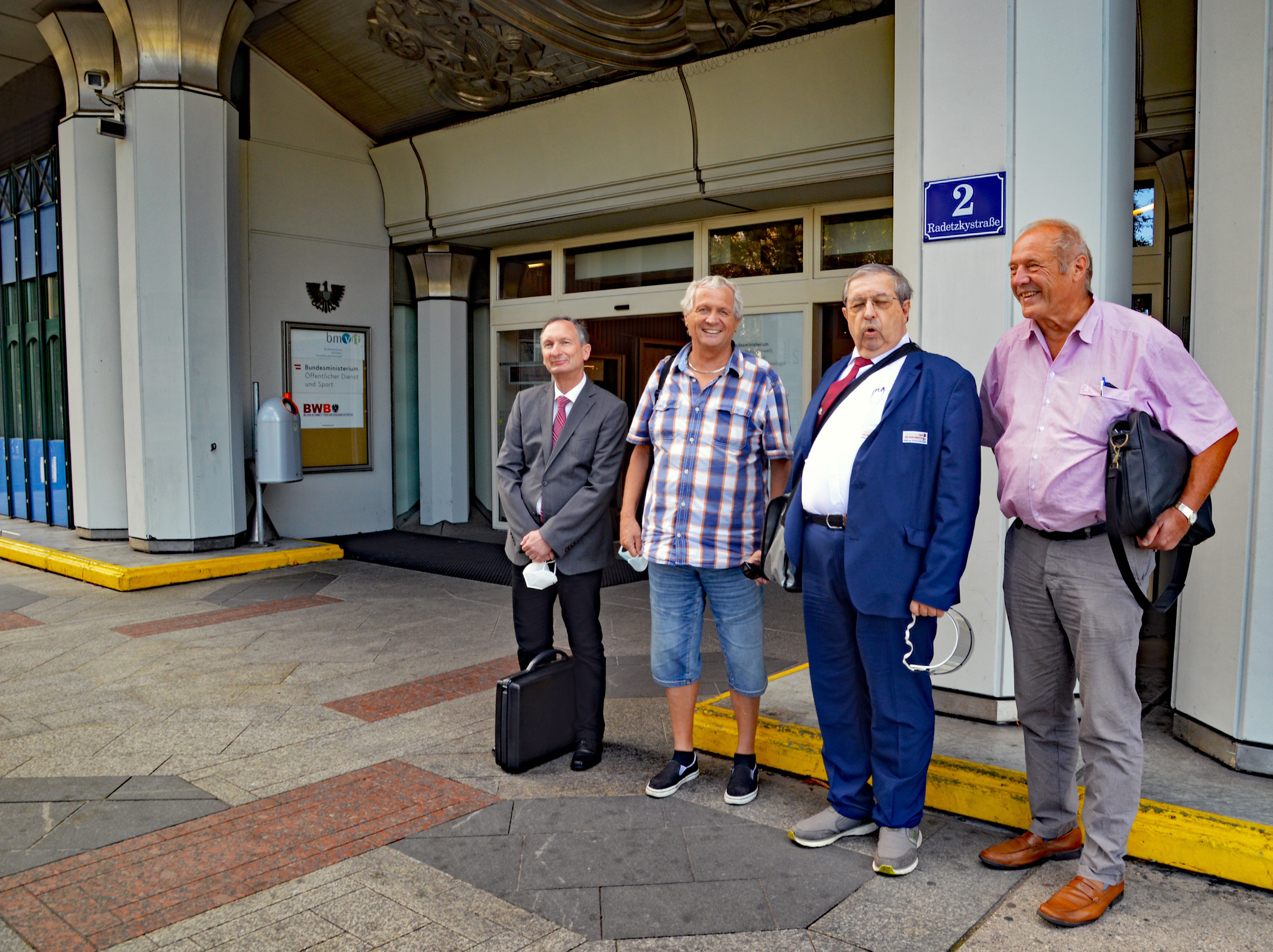 Gruppenbild vor dem Haus des Verkehrsministeriums in Wien Radetzkystraße 2, Im Foto die gut gelaunte Verkehrsinitiativen-Delegation v.l.: Wilhelm Mack Kundenbeirat Südostbayernbahn (BAY), Mag. Paul Stefan Lebensraum Mattigtal (OÖ), Richard Fuchs Rote Elektrische (SBG), Martin Schön Verkehrsforum Berchtesgadener Land & Rupertiwinkel (BAY).