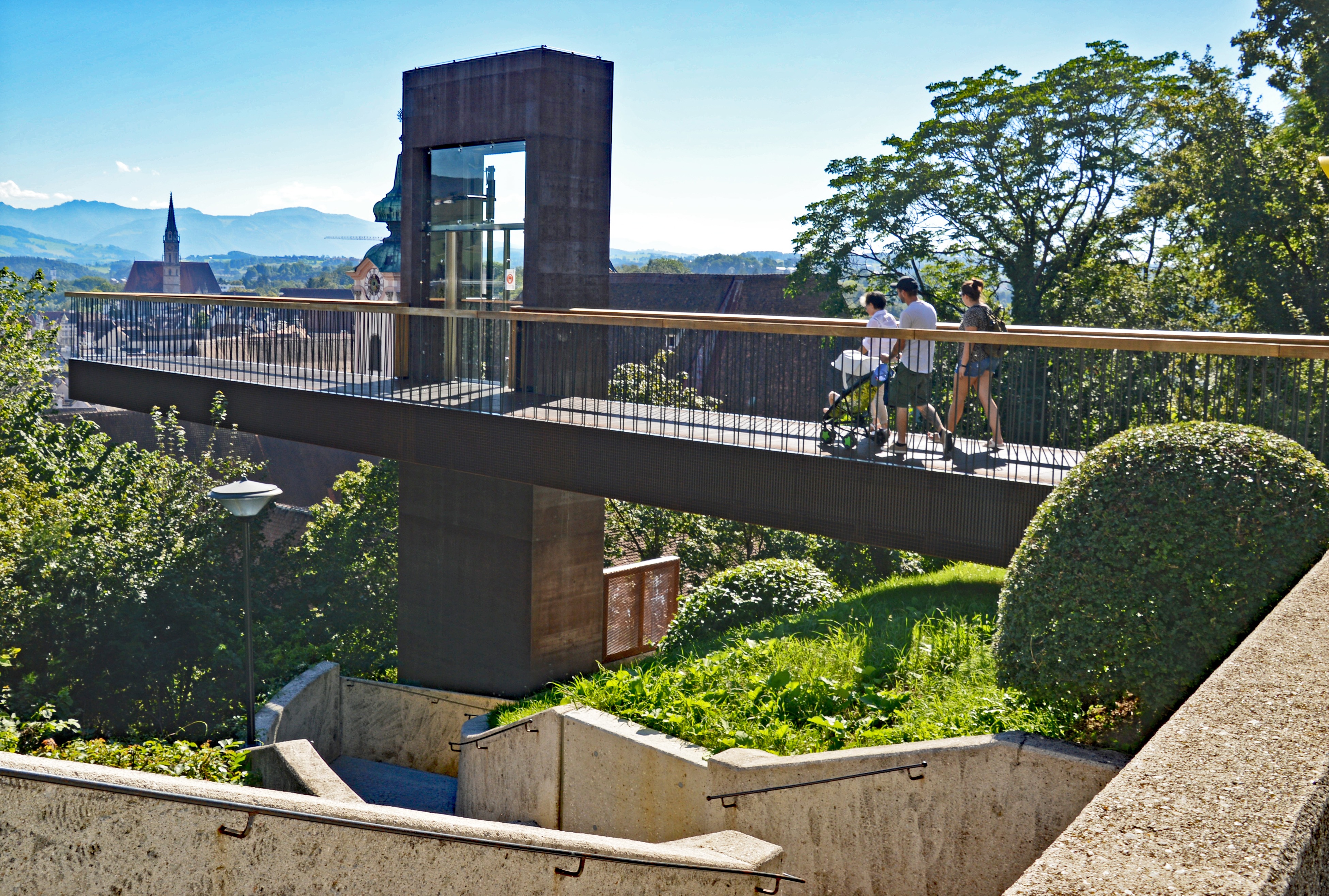 Es braucht einen konzentrierten Blick von der Zwischenbrücke zur Michaelerkirche und dem Restaurant Tabor-Turm am Berg, um den Lift zu sehen. Der Turm fügt sich perfekt in die Natur ein. Der Eingang nutzt einen früheren Luftschutzstollen.
