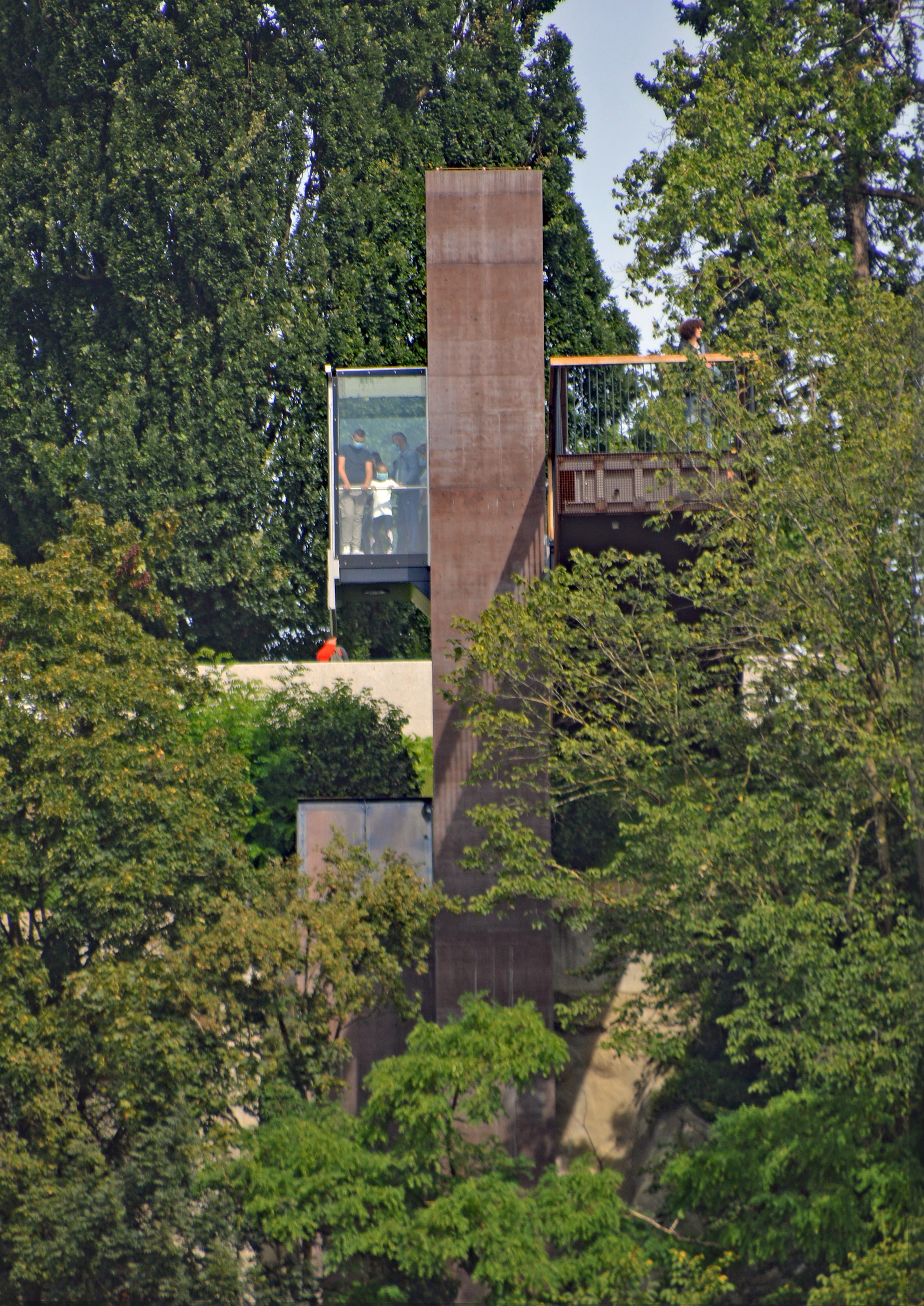 Panorama-Lift Steyr-Tabor - Bilderbogen Lift ist fast unsichtbar. Der Lift ist eine gelungene Konstruktion, die in die Natur bestens integriert wurde! Erst wenn man etwas näher kommt. kann man den Lift-Turm erkennen.