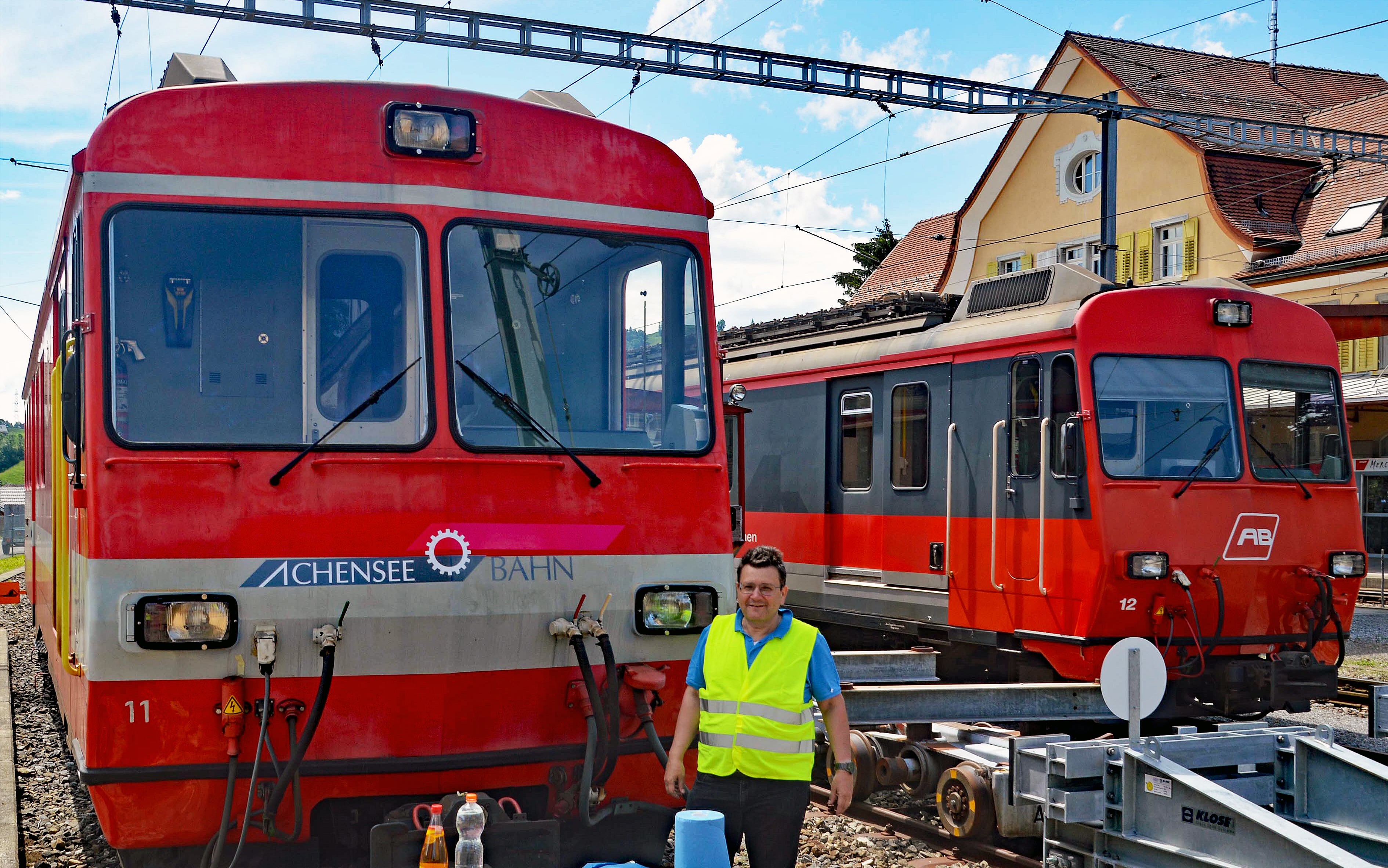 Appenzellerbahn Abtransport der Triebwagen BDeh-4-4 11+12 vom Bahnhof Gais, Vorbereitung durch Beklebung Eigentumsbezeichnung "Achenseebahn" der Triebwagen 11 + 12 mit Achenseebahn-Vorstand Mag. Georg Fuchshuber