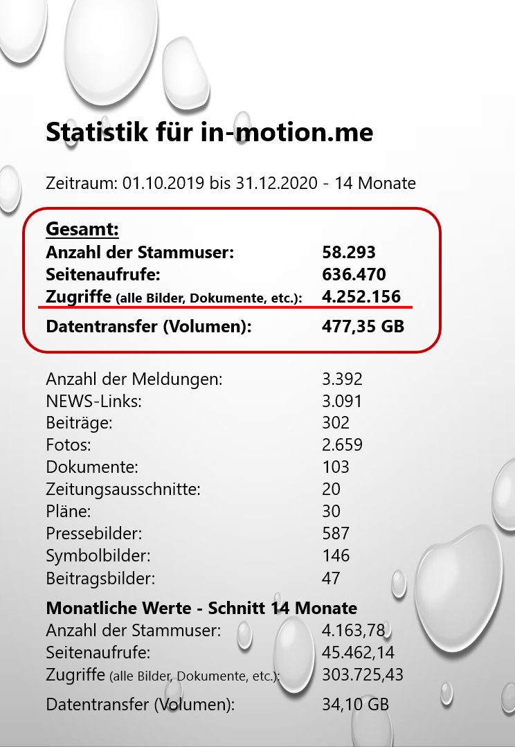 Die teilweise auch kritische Berichterstattung zeigt größtes Interesse, was sich in den Zugriffszahlen niederschlägt. Hofberichterstattung gibt es von inseratengesteuerten Medien genug. Dies ist nicht die Philosophie von www.in-motion.me!