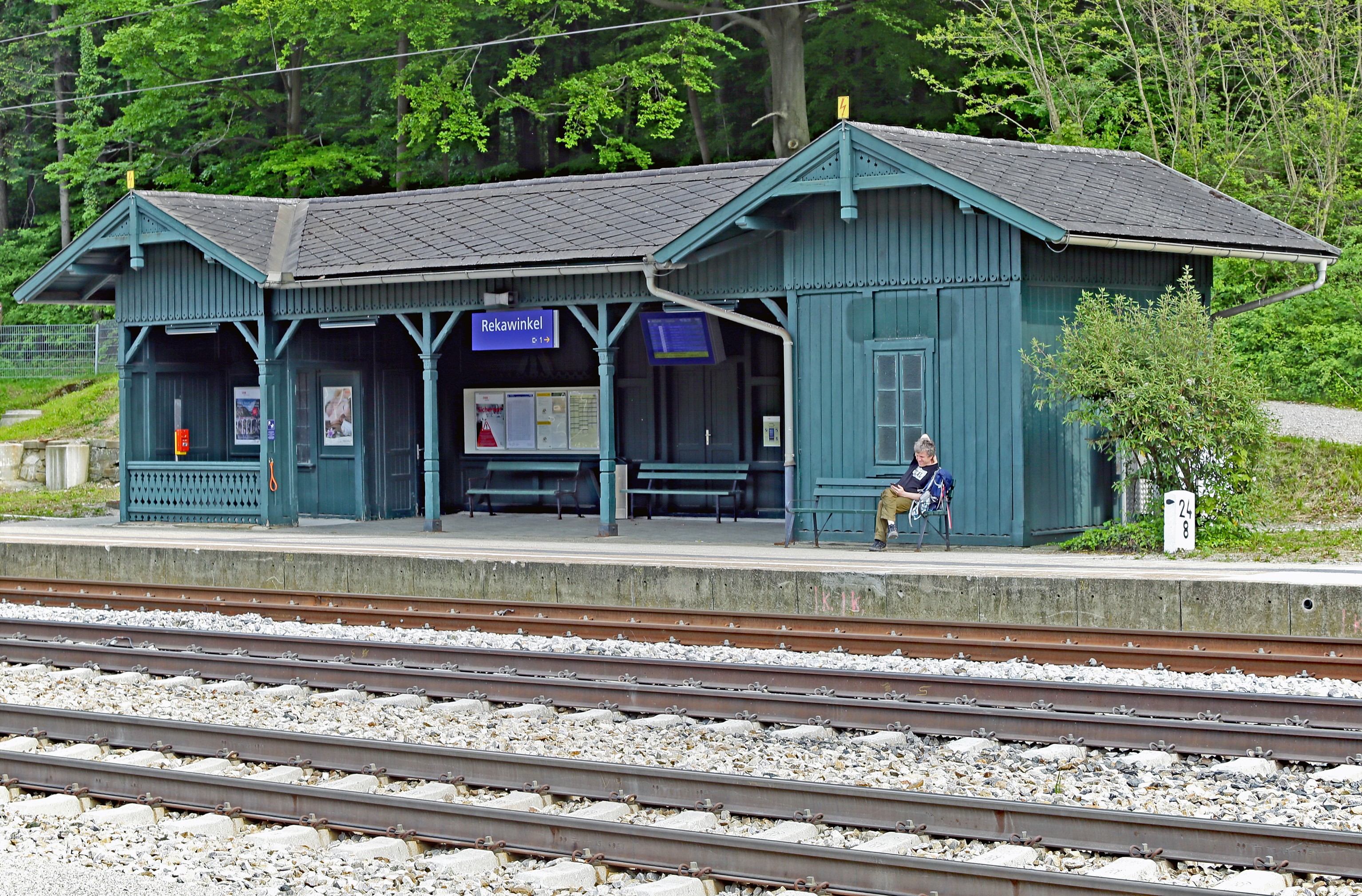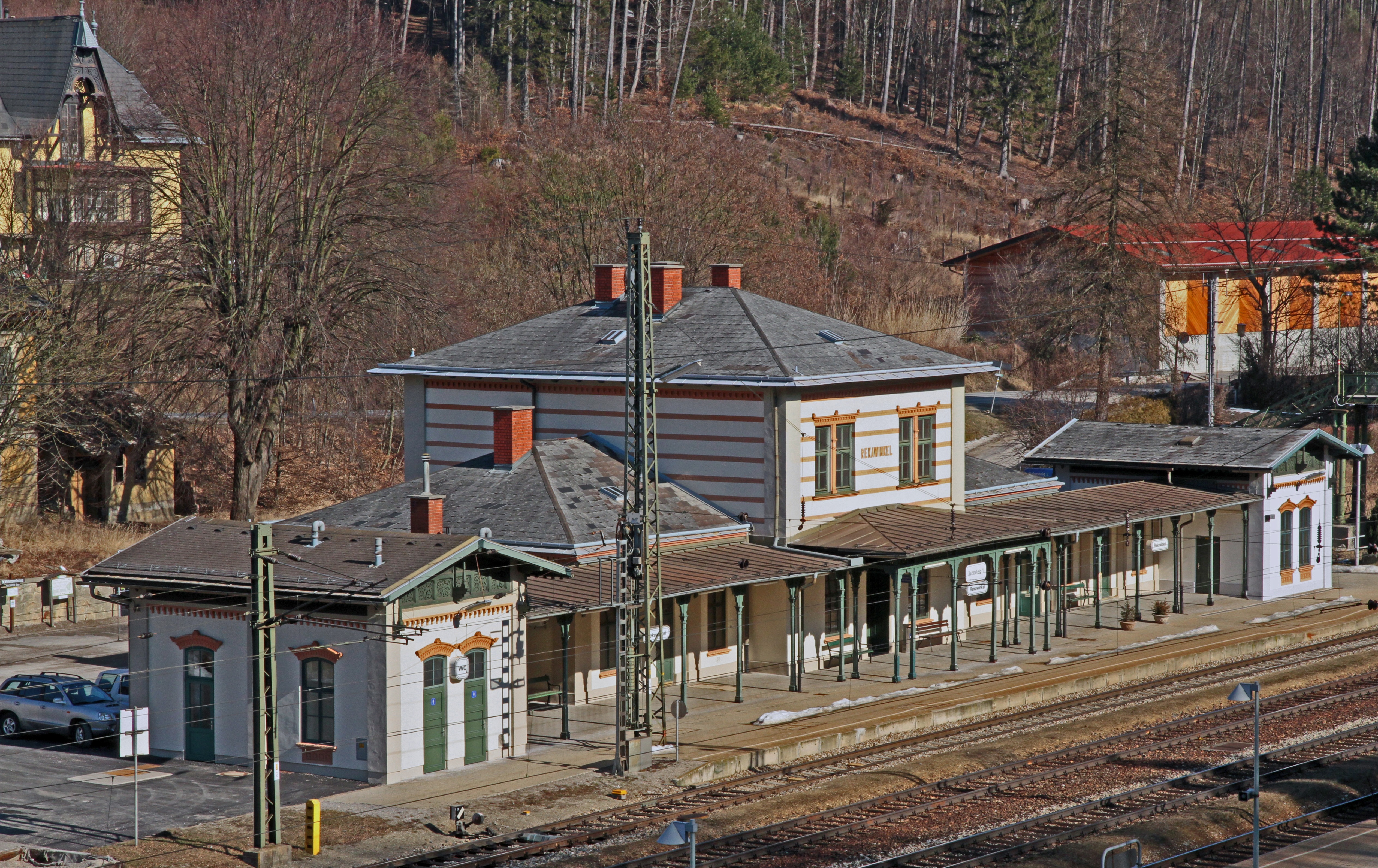 Der Bahnhof Rekawinkel steht, als einer der wenigen Bahnhöfe, unter Denkmalschutz und wurde vorbildlich restauriert, auch wenn man das WC vergessen hat. Die Haltestellenhütte gegenüber, in Fahrtrichtung Wien, ist Teil des historisch wertvollen Ensembles.