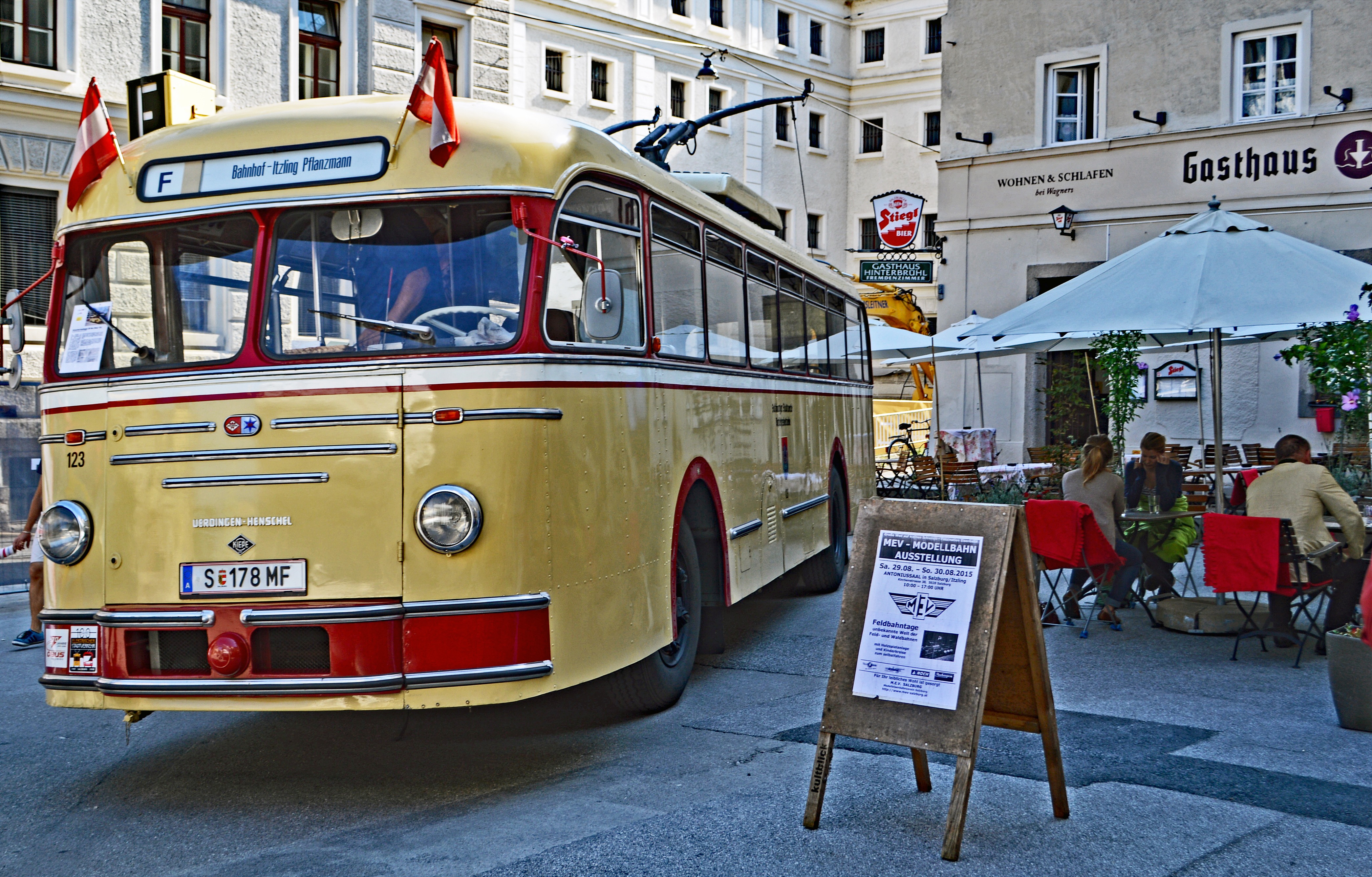 Obus 123 Verein Pro Obus (Eigentümer Jonathan Ward) bei einer Fahrzeugschau am Kapitelplatz 08/2015. Anlaß war eine Modelleisenbahn-Ausstellung des MEV-Salzburg im Café Holztrattner, in der Obus-Modelle gezeigt wurden.