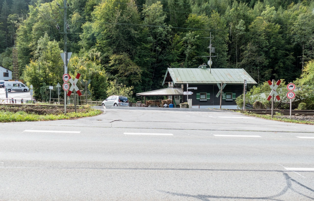 Bahnübergang - Fahrtrichtung Bad Reichenhall. Da hier einmal pro Tag ein PKW verkehren könnte, muss natürlich der Zug auf 5km/h abbremsen und das in der Steigung.