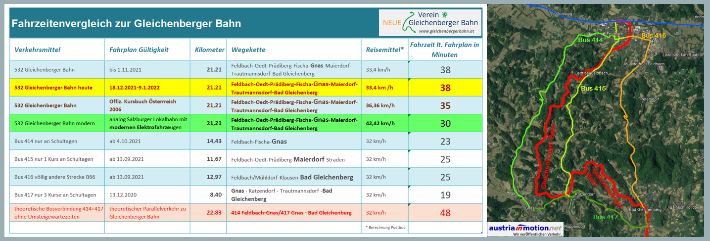 Selten wird so offensichtlich gelogen, werden Vorurteile gepflegt und Gerüchte verstreut, wie bei der Gleichenberger Bahn. Dazu schreckte man nicht einmal davor zurück, eine Buslinie zu vergewaltigen, nur um den Anschein zu erwecken, sie sei als Konkurrenz leistungsfähiger und wirtschaftlicher als die Bahn. Nun musste man dazu nur einige Fakten schaffen, um die Gleichenberger Bahn, nur einigermaßen glaubwürdig, schlecht reden zu können. Der Bus muss den kürzesten Weg zwischen Feldbach und Bad Gleichenberg, abseits aller Orte und meist ohne Halt, fahren, nur um einigermaßen die Fahrzeit einhalten zu können. „Sicherheitshalber“ ließ man die Streckenhöchstgeschwindigkeit der Gleichenberger Bahn auf 40 km/h heruntersetzen, damit wenigsten der Bus ein paar Minuten schneller fährt. Bereits vor 90 Jahren fuhr die Bahn schneller als heute. Mit zeitgemäßen modernen Nahverkehrstriebwagen kann man die Fahrzeit auf der Bahn auf rund 25 Minuten reduzieren, die man mit dem Bus, trotz Fahrplan, niemals erreichen kann.