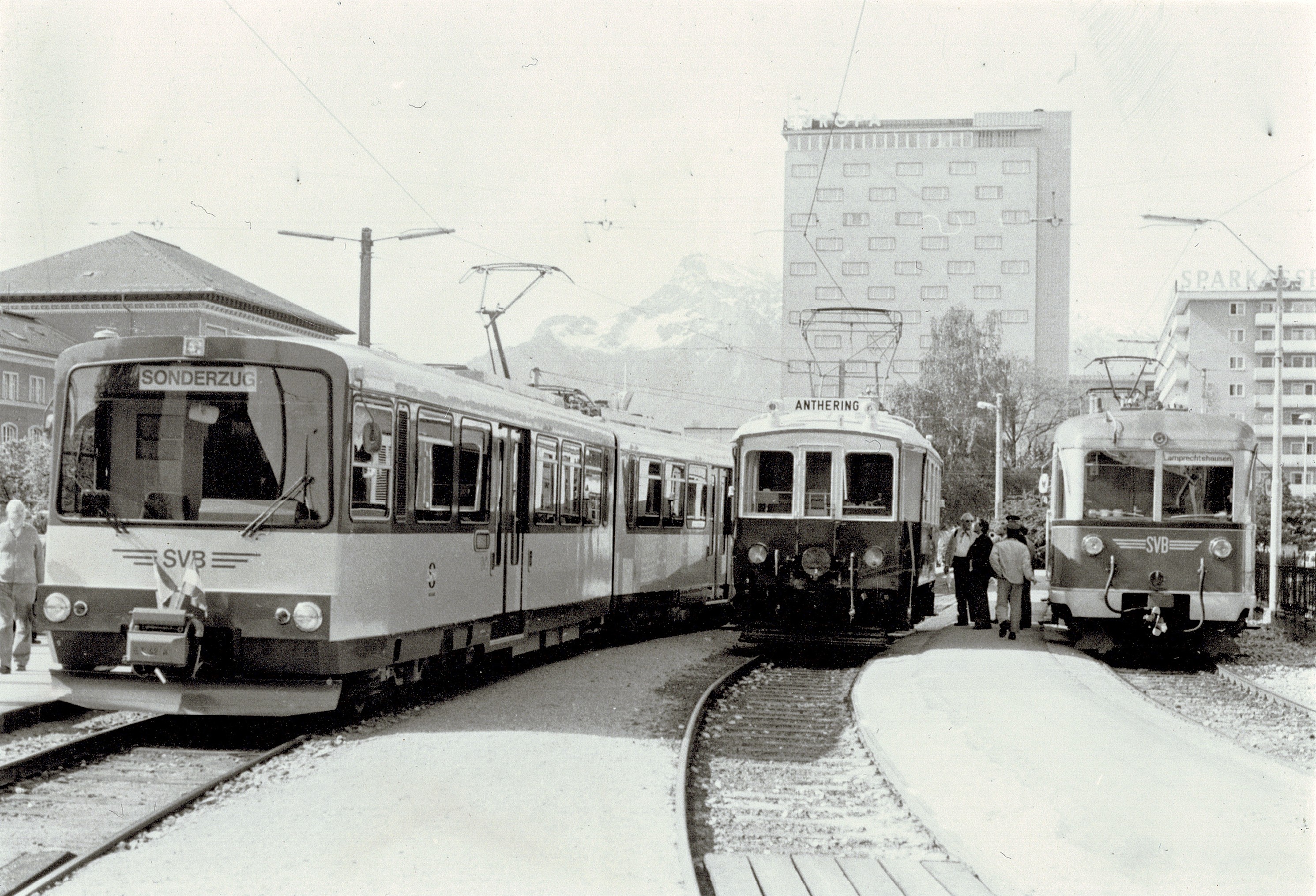 75 Jahre Salzburger Lokalbahn 1984 Fahrzeugparade Salzburg Lokalbahnhof v.l.: Stadtbahn-Gelenk-Triebwagen Reihe 40, "Rote Elektrische" Triebwagen ET3, Vierachs-Triebwagen Reihe 30, im Hintergrund Hotel "Europa"
