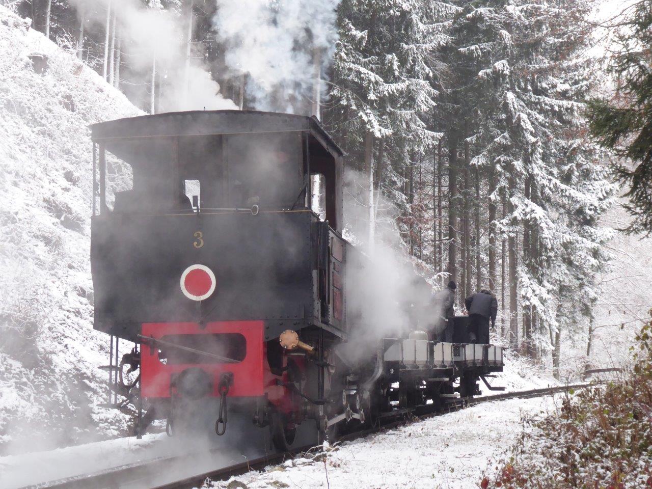 Lok 3 bei der Bergfahrt durch den adventlichen Bergwald mit einem Dienstgüterzug zwischen Fischl und Eben Lebenszeichen der Achenseebahn, Lok 3 "Georg" Lebenszeichen der Achenseebahn, erster Beiwagen in Ursprungszustand.