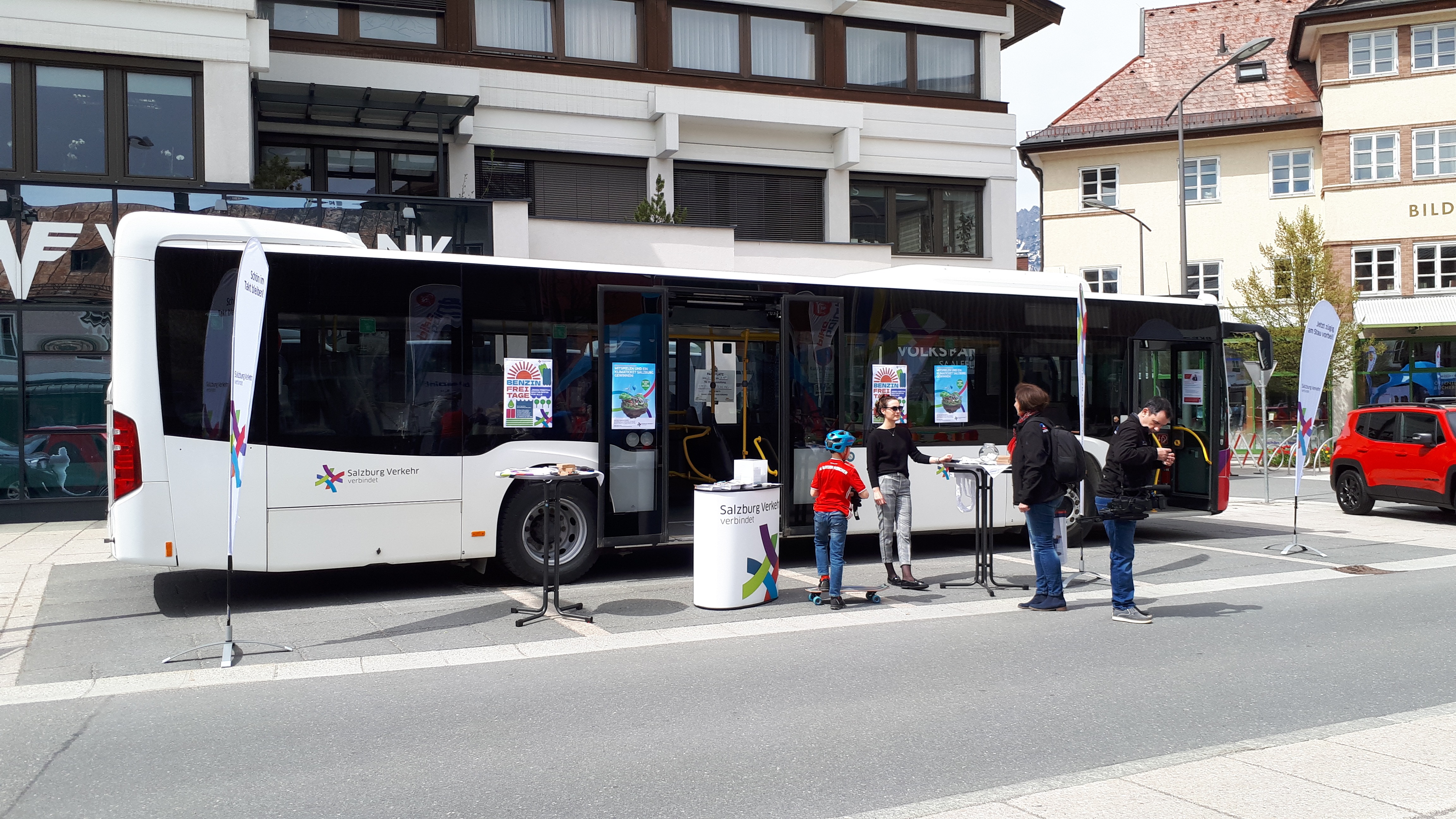 Ausgestellt ist ein moderner Niederflurbus mit offenen Türen, dieser ist jedem Besucher zugänglich. Vor dem Bus sind zwei freundliche Mitarbeiter vom SVV die für jegliche Fragen zum "Klimaticket Salzburg" oder zu anderen Angeboten gerne Auskunft geben.