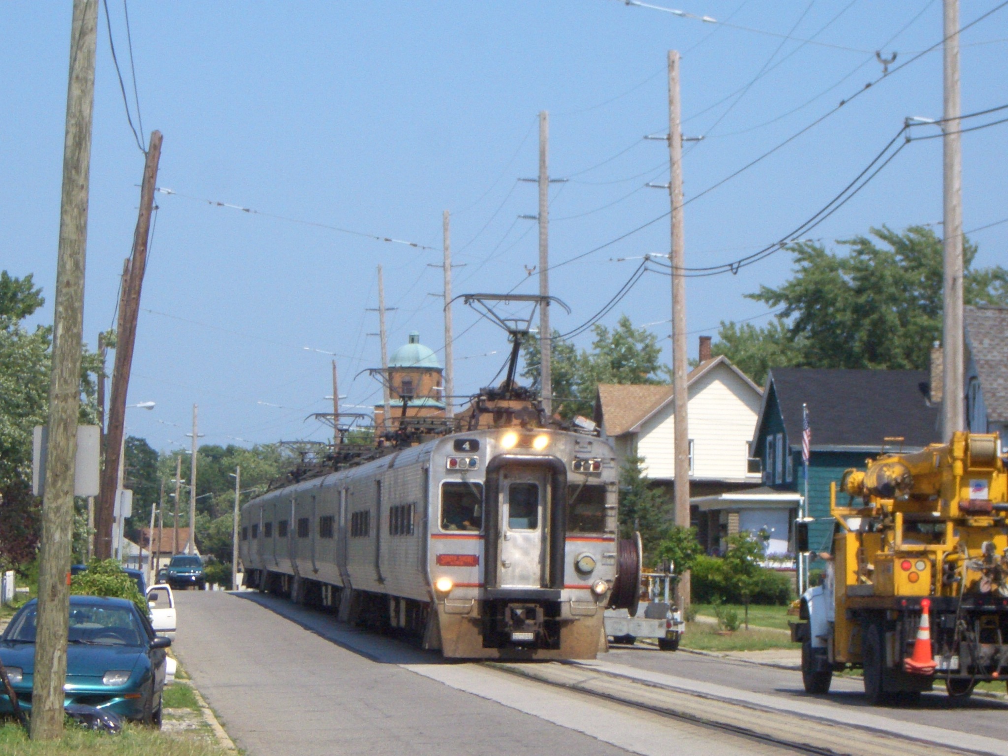 Ein 4 Wagenzug in Fahrtrichtung Chicago durchfährt in Michigan City die 11. Straße auf Höhe Spring Street– es führt Triebwagen 4 (Nippon Sharyo/1983).