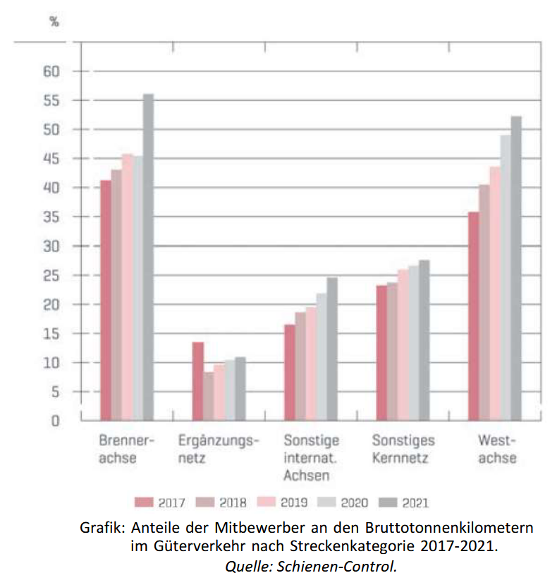 Nach Streckenkategorien des ÖBB-Netzes und gemessen an den Bruttotonnenkilometern vergrößerten sich 2021 die Marktanteile der Mitbewerber überall. Am stärksten ausgeprägt ist der Wettbewerb auf der Brenner- und Westachse, hier erbrachten die Unternehmen außerhalb des ÖBB-Konzerns in Summe bereits 56 bzw. 52 Prozent der gesamten Verkehrsleistung. Mit jeweils über 40 tätigen Unternehmen waren die Weststrecke und die sonstigen internationalen Achsen (z.B. Tauern- und Semmeringstrecke) die von den meisten Unternehmen befahrenen Netzabschnitte im Güterverkehr. Im Wesentlichen findet der komplette Transitgüterverkehr auf den drei genannten Abschnitten statt.