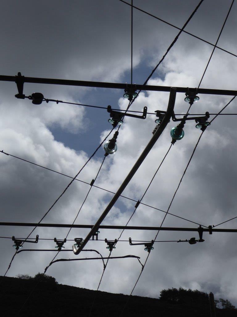Ansicht einer aufwendigen Fahrleitungsweiche für die doppelpolige Drehstromfahrleitung.
