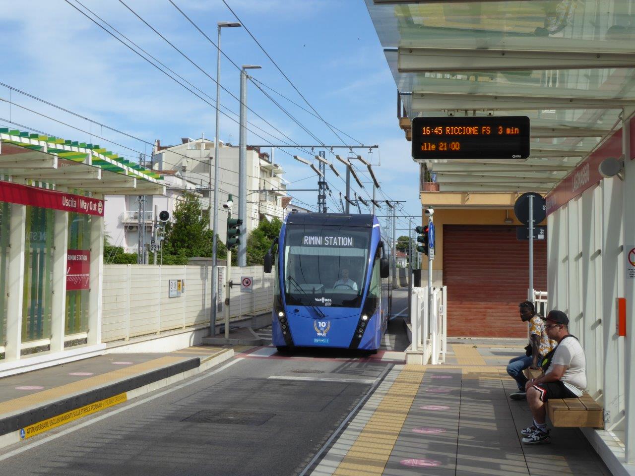 The Rimini – Riccione TBRT line is the first step of a new efficient trolleybus system in and around Rimini. The next step will bring a further 4,2 km line between Rimini FS and the Rimini fair ground. There are plans for a 3rd step (Santarcangelo di Romaga, about 8 km) and a 4th step (Riccione – Cattolica even about 8 km).