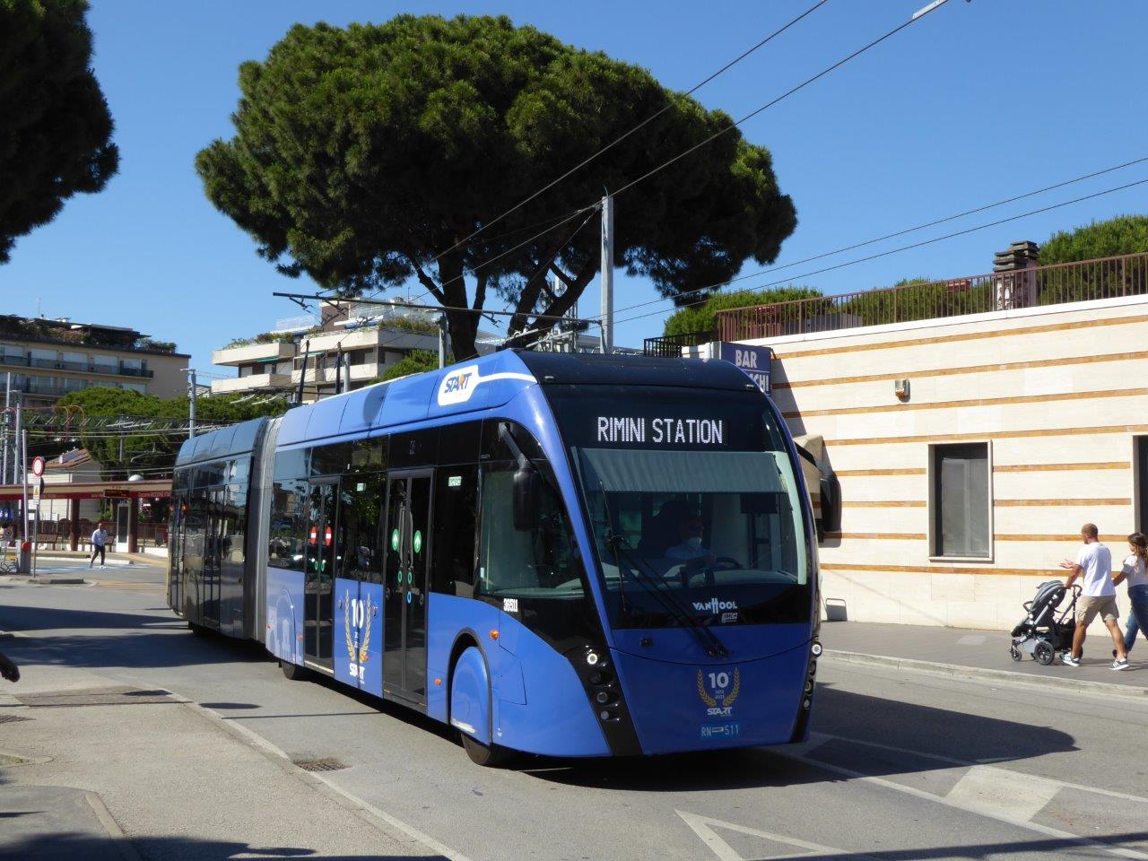 The line called „Metromare“ operates every 15 minutes between 5 a.m. and 0.30 a.m. linking also the Rimini airport with Rimini and Riccione as well. There are 5 trolleybuses of type VanHool Exquicity 18T in serevice, one of them is used as a spare trolleybus at Rimini FS. In stock are 9 VanHool/Kiepe trolleybuses (36511-36519) for Metromare beside 6 trolleybuses for traditional line 11. The whole line is fitted with overhead with one additional turning loop at Miramare Airport. The auxiliary drive is only used for depot rides.