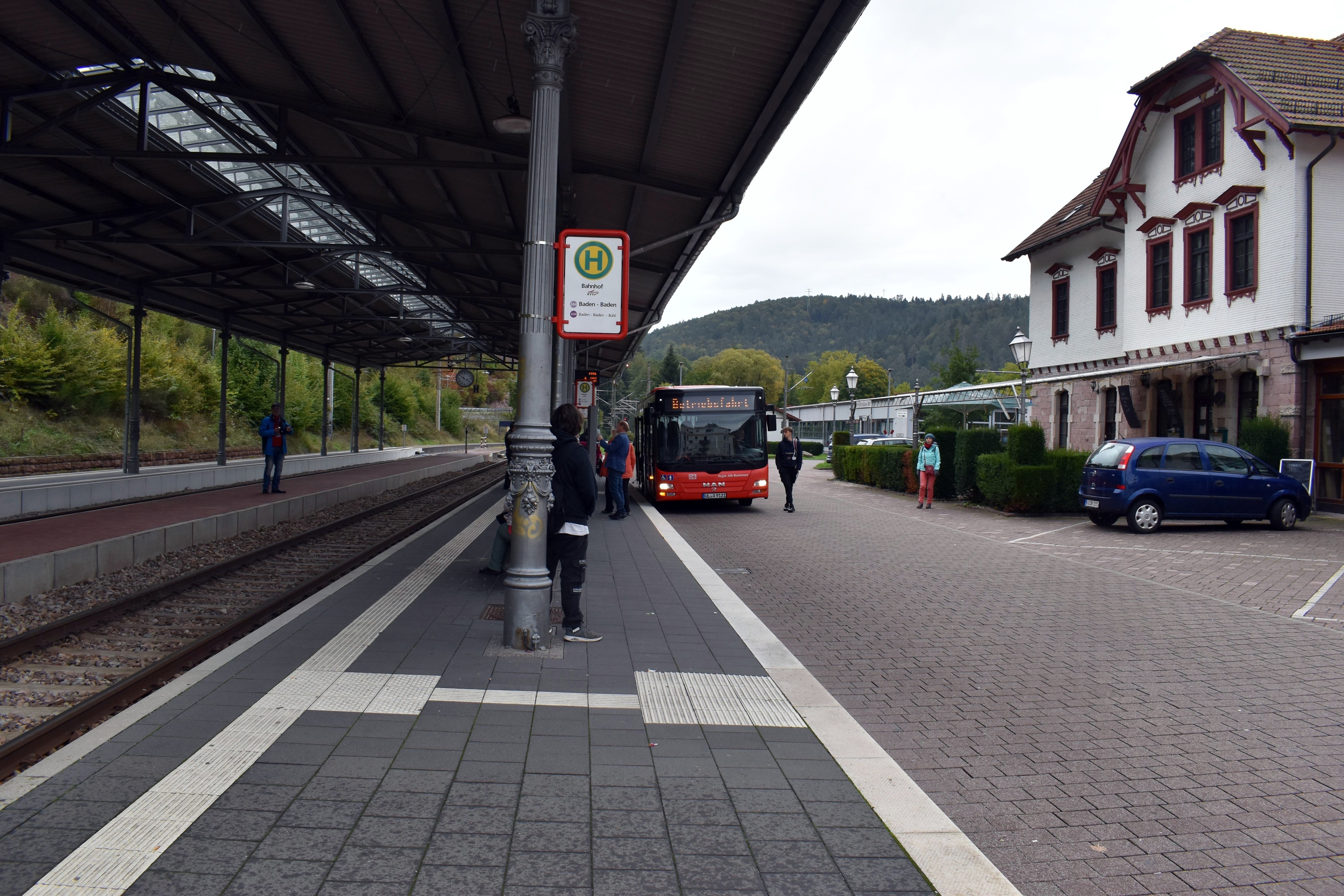 AVG-Bahnhof Ettlingen mit dem zweiten Teil der ursprünglichen Bahnhofshalle des Bahnhofs Baden-Baden