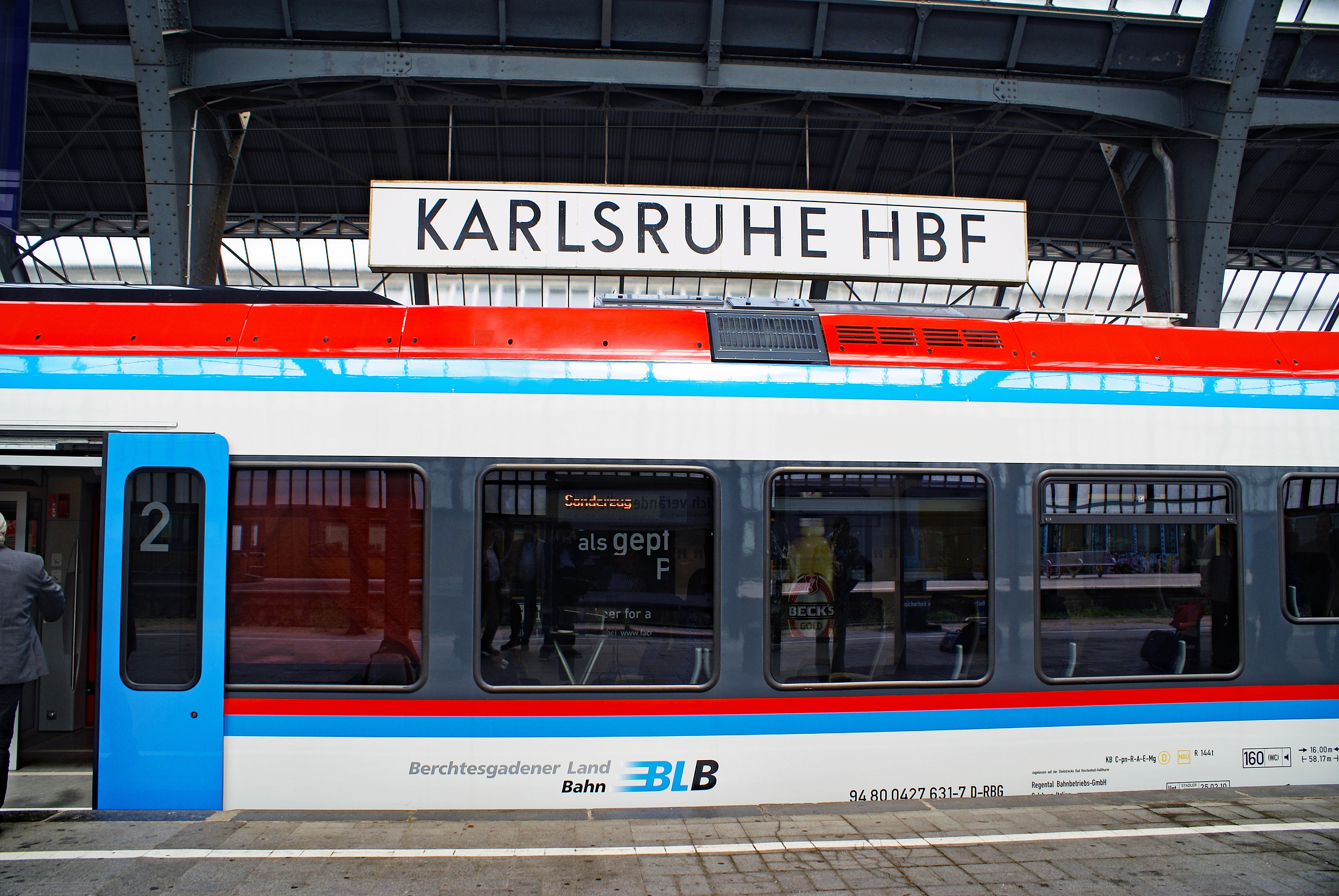 Schon die Anreise von Salzburg nach Karlsruhe war ein spezielles High-Light mit dem Elektrotriebwagen 131 der Berchtesgadener Land Bahn BLB, der unter der Verantwortung von Arnulf Schuchmann gefahren ist. Der BLB-Triebwagen ET 131 war durchaus im Karlsruher Hauptbahnhof ein markanter Farbtupfer.