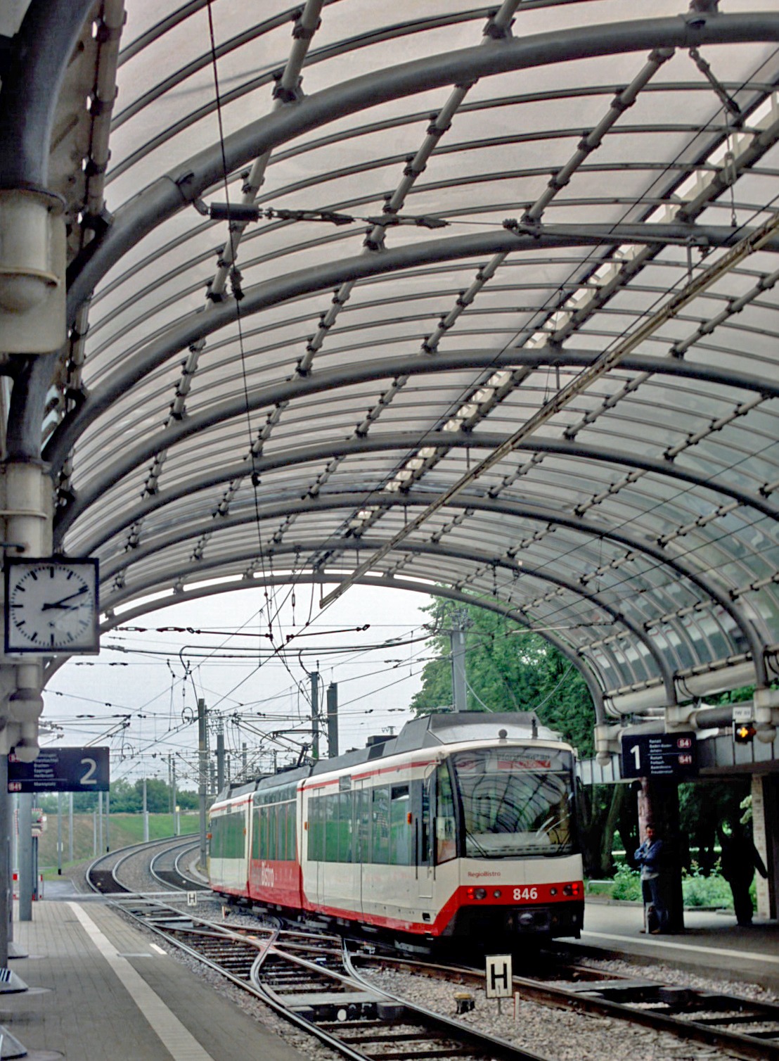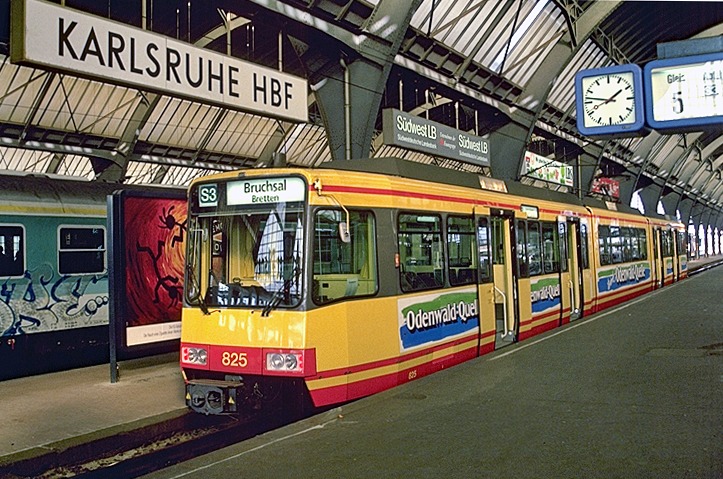 Zweisystemtriebwagen 825 abfahrtbereit Richtung Bruchsal in Karlsruhe Hbf. Dieses Foto war das Farbtitelbild der allerersten farbigen Ausgabe der vereinseigenen Zeitschrift "Regionale Schienen" 1996.
