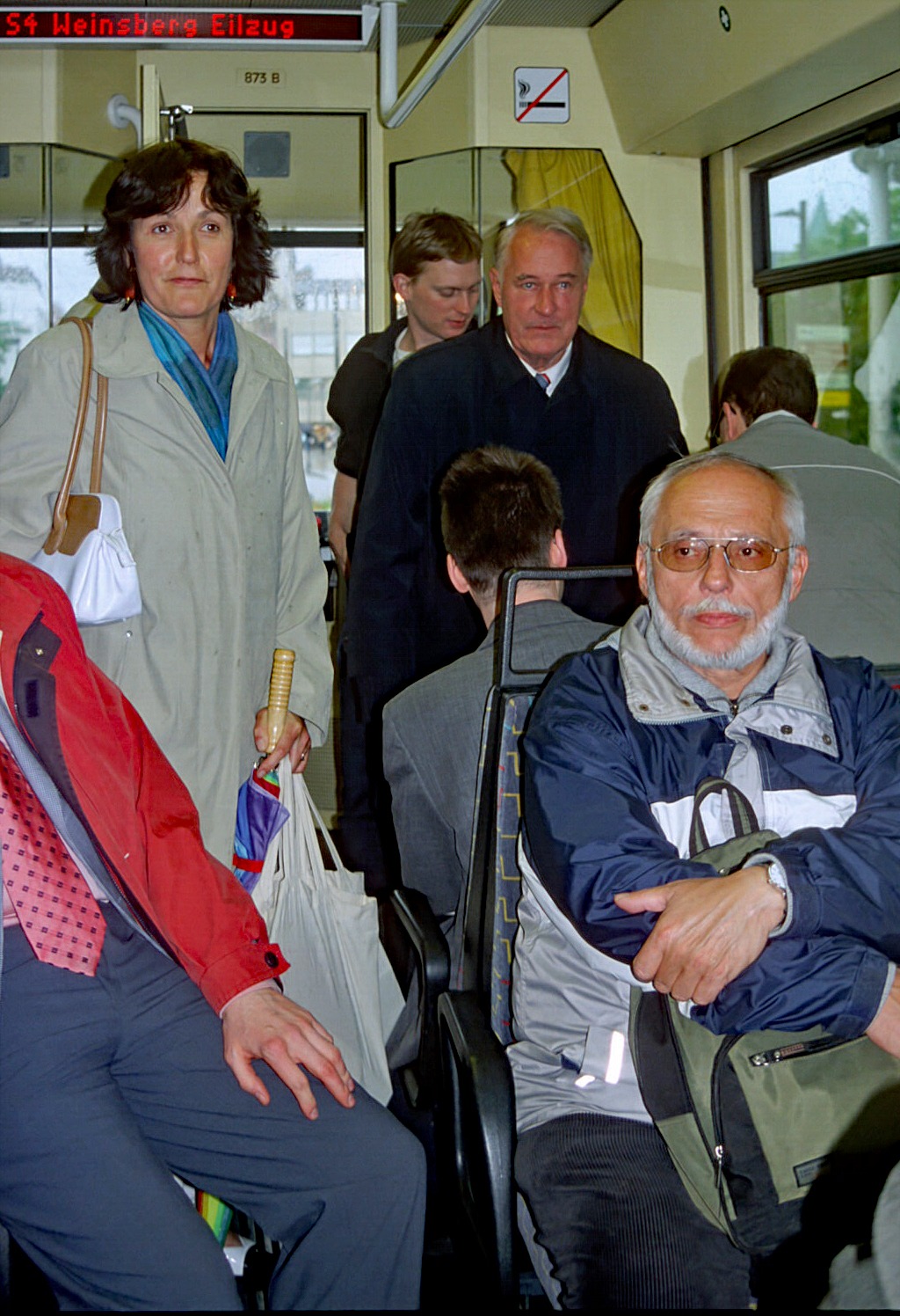 Sonderfahrt Reisegruppe in Karlsruher Stadtbahn-Triebwagen u.a. mit Landesrat Dr. Wilfried Haslauer, heute Landeshauptmann von Salzburg, vorne Dr. Arnulf Schuchmann Berchtesgadener Land Bahn