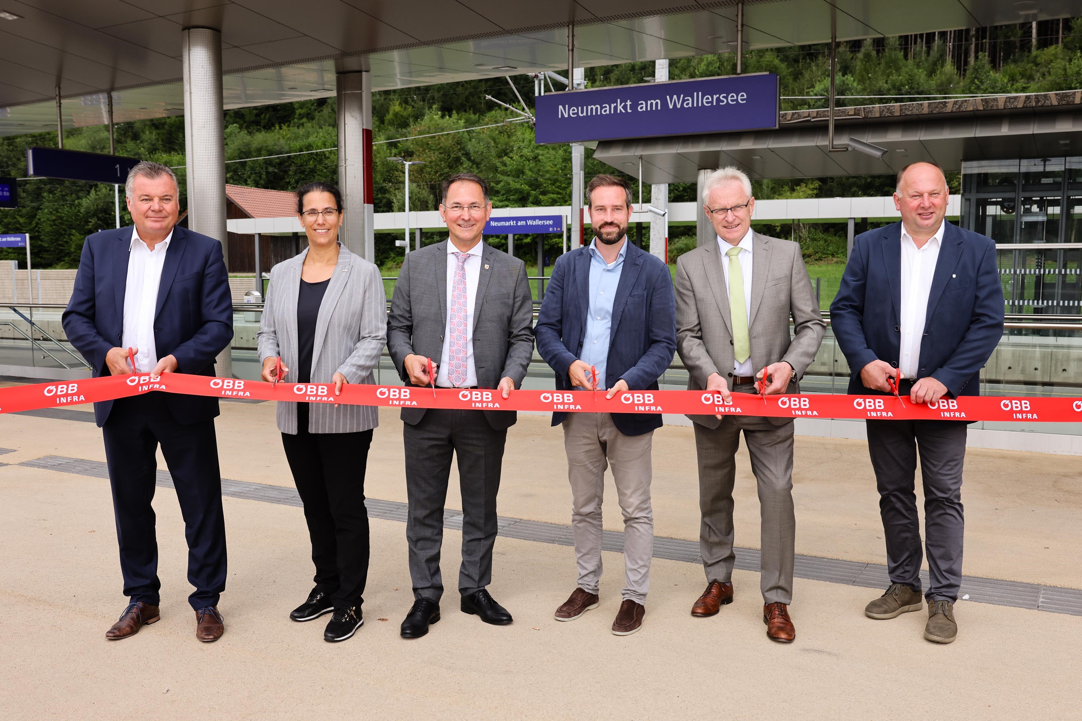 Verlängerte und elektrifizierte Mattigtalbahn: LR Günther Steinkellner (OÖ), Judith Engel (ÖBB), Bgm. Adi Rieger (Neumarkt), LR Stefan Schnöll, BR Ferdinand Tiefnig (OÖ) und Vize-Bgm. Franz Leikermoser (Straßwalchen). © ÖBB/Scheiblecker