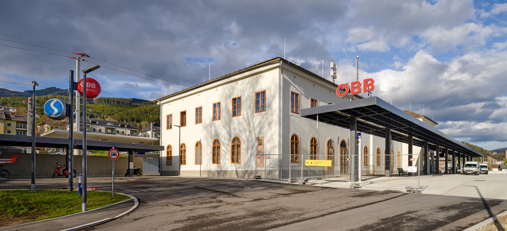 Am 13. Mai 2023 konnte der letzte große Bauabschnitt beendet werden. Mit der Fertigstellung des Bahnhofsgebäudes sind wieder alle Service-Einrichtungen für die Reisenden zentral im Bereich Kaplanplatz gebündelt. Somit sind das Reisezentrum, Wartebereiche und WCs jetzt wieder im Bahnhofsgebäude verfügbar. Ebenfalls abgeschlossen sind die Arbeiten an der Bushaltestelle direkt vor dem Bahnhofsgebäude, somit ist der Umstieg von Bahn zu Bus komfortabel direkt am Bahnhof möglich. Über den Personendurchgang erreicht man wieder alle Bereiche auf kurzem Weg und natürlich alles barrierefrei. In Verbindung mit der sehr großen Erweiterung der Parkmöglichkeiten für PKW, Rad oder Motorrad auf zusammen über 550 Stellplätze, ist am Bahnhof ein wirklicher Quantensprung gelungen, der auch für die Zeit nach der Inbetriebnahme des Semmering-Basistunnels ausreichende Kapazitäten für das Umsteigen auf die Bahn bietet. Der Reiseweg nach Graz und Wien beträgt dann jeweils rund 1 Stunde.