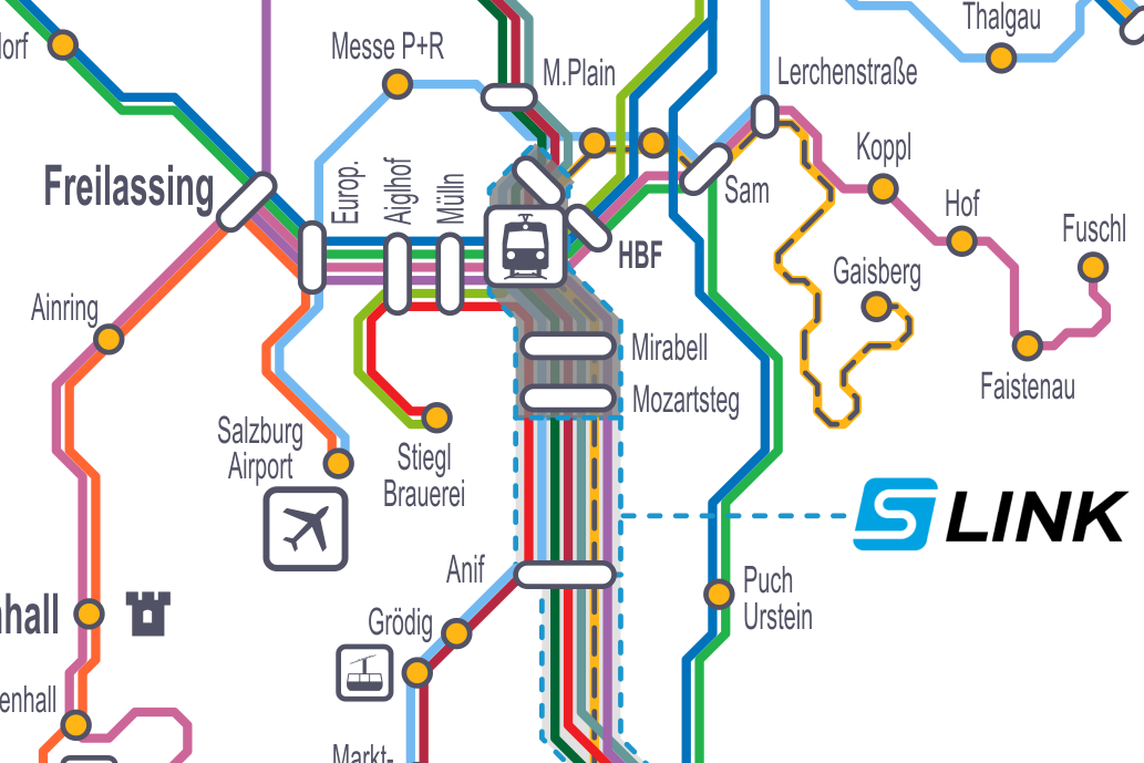 Und damit kommen wir zu den Zulaufstrecken. Schon heute umgibt den Zentralraum Salzburg ein Schienennetz von rund 790km, insgesamt laufen 7 Strecken auf Salzburg zu. Diese gilt es zu vernetzen und mit Hilfe von 2-System-Stadtbahn-Triebwagen wird man künftig von ÖBB- oder DB-Gleisen direkt und ohne Umsteigen auf einer der städtischen Haltestellen zum Stadtverkehr, aufs Rad oder auf seine Füße "umsteigen" können.