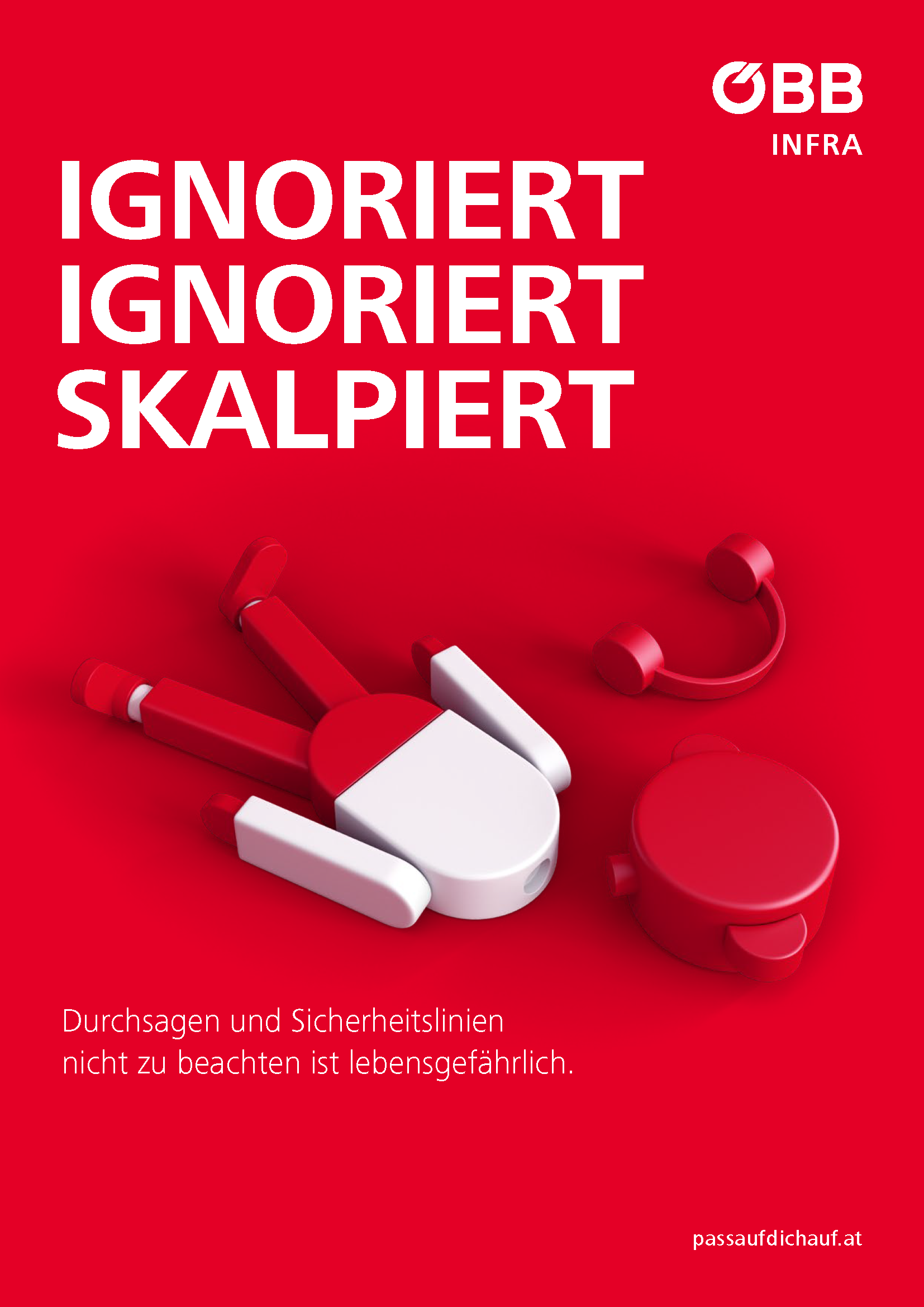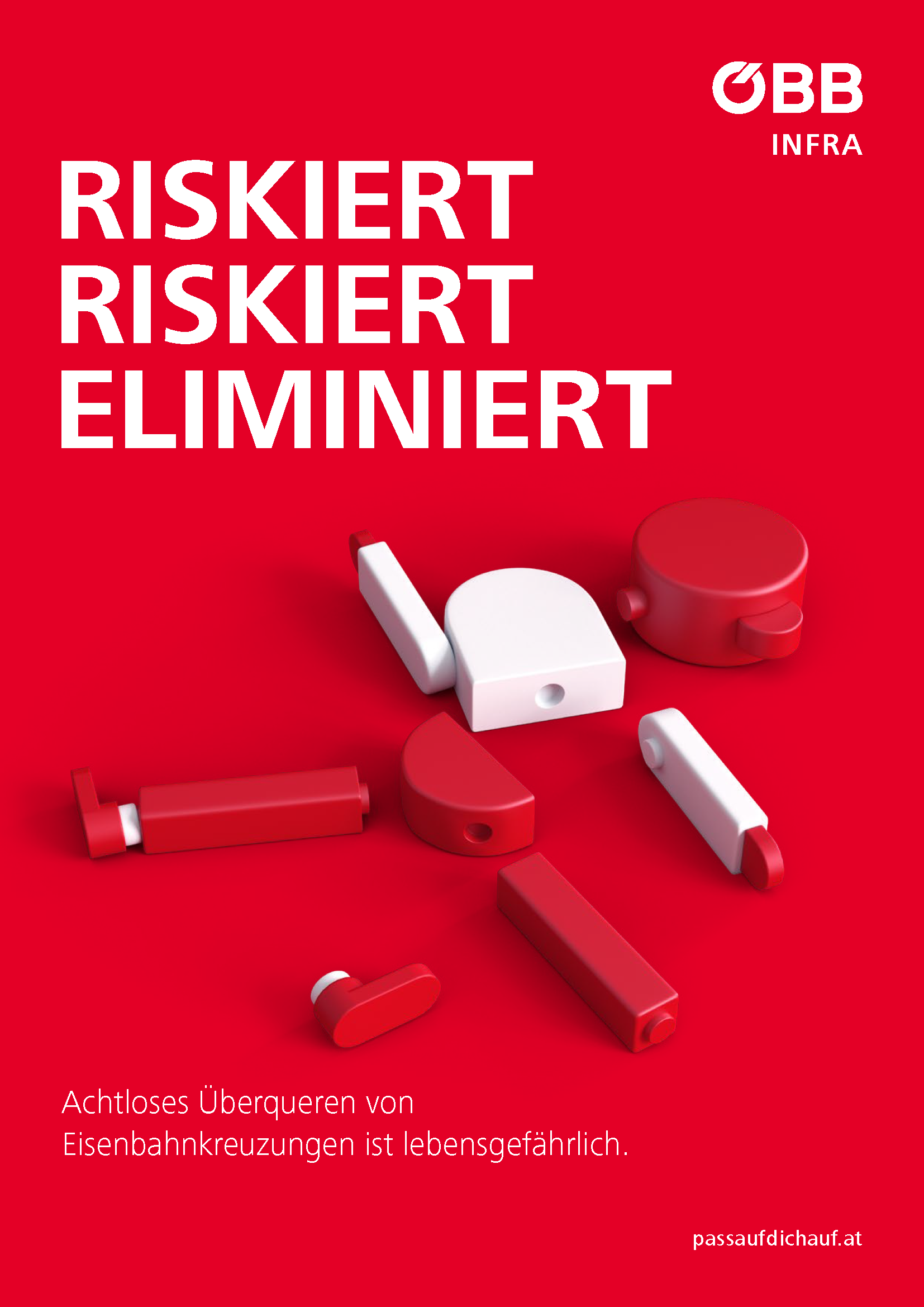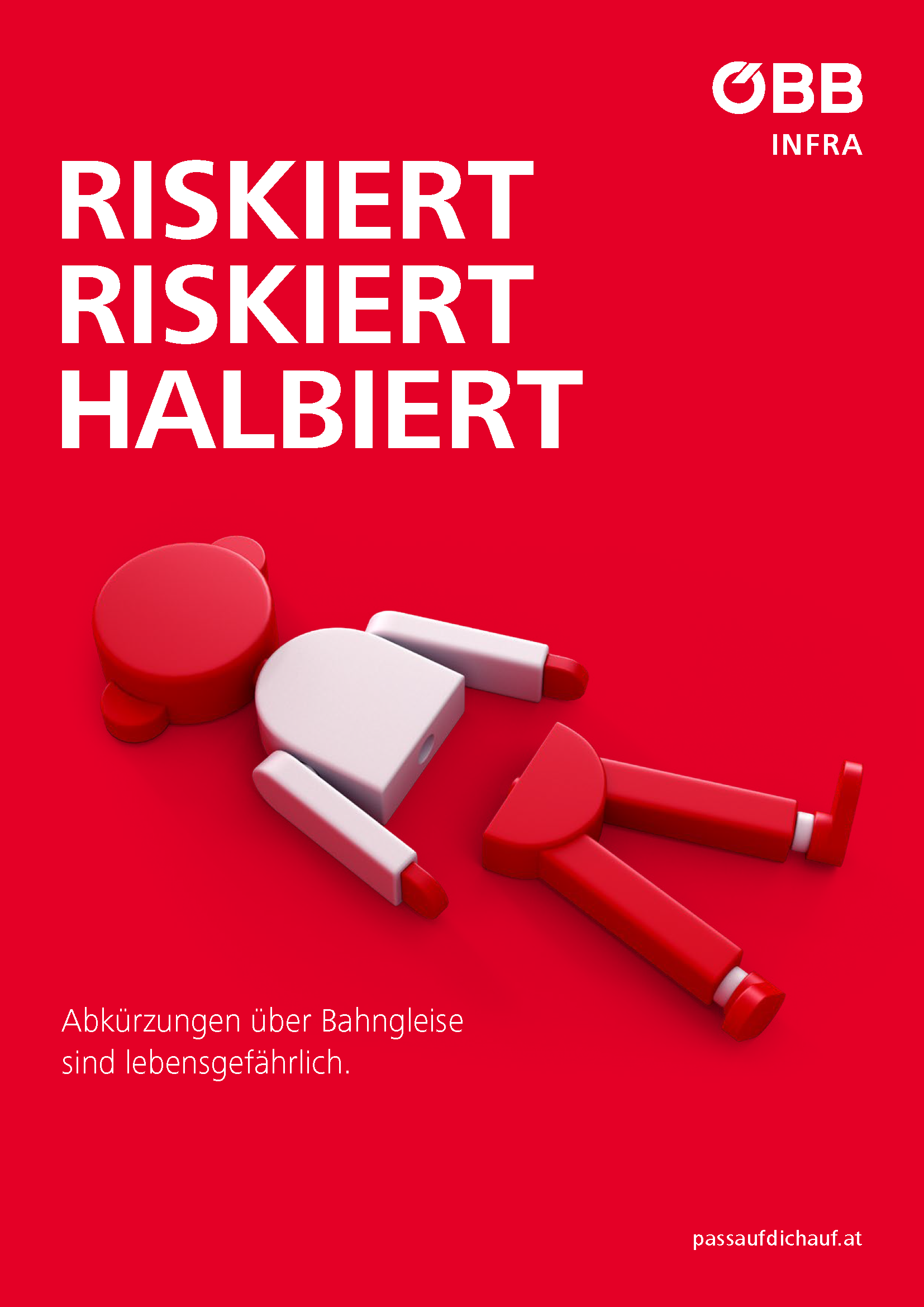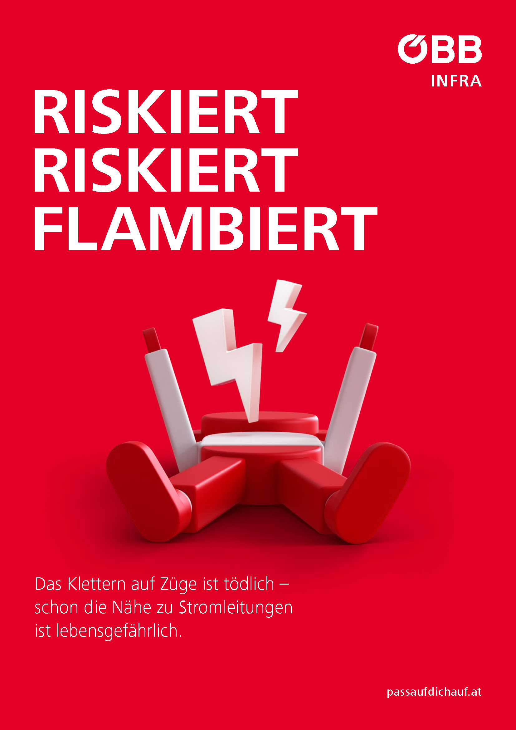 Keine Kompromisse bei der Sicherheit gibt es bei den ÖBB. Das drückt auch die neue maximal aufmerksamkeitsstarke Sicherheitskampagne aus. Sie hat das Ziel das Bewusstsein für die sichere Benutzung von Bahnanlagen zu schärfen – mit bewusst aufrüttelnden Sujets auf Bahnhöfen, in Print-, Online- und den Sozialen-Medien, die zum Nachdenken und zur Diskussion anregen sollen. Es geht um (lebens-)gefährliche Situationen beim verbotenen Queren von Bahngleisen, am Bahnsteig, beim Klettern auf Wagons durch Stromüberschlag oder aber um Unfälle an Eisenbahnkreuzungen.