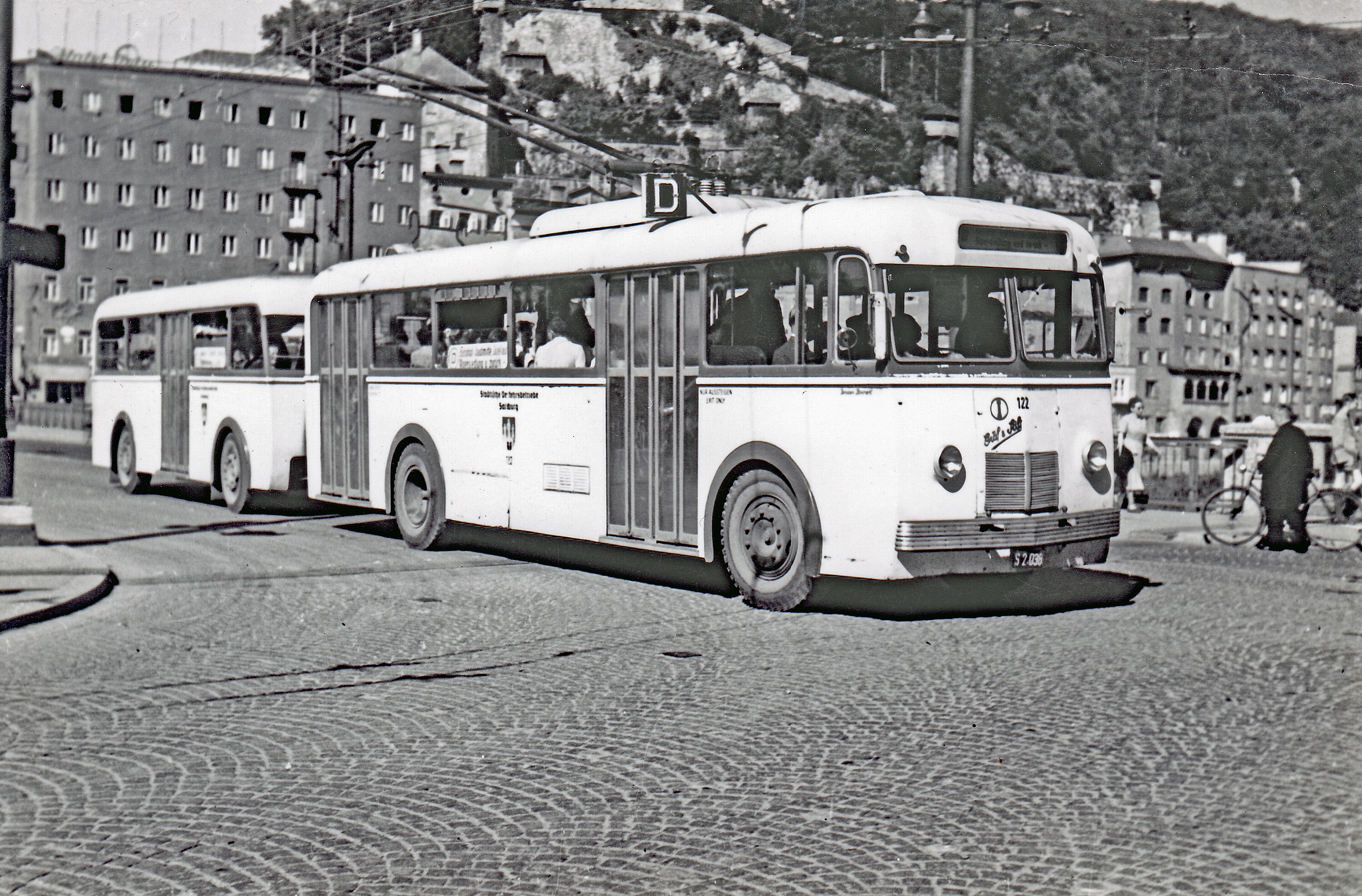 Historische Obus-Fotos Salzburg Linie "D" mit Anhänger auf der Staatsbrücke