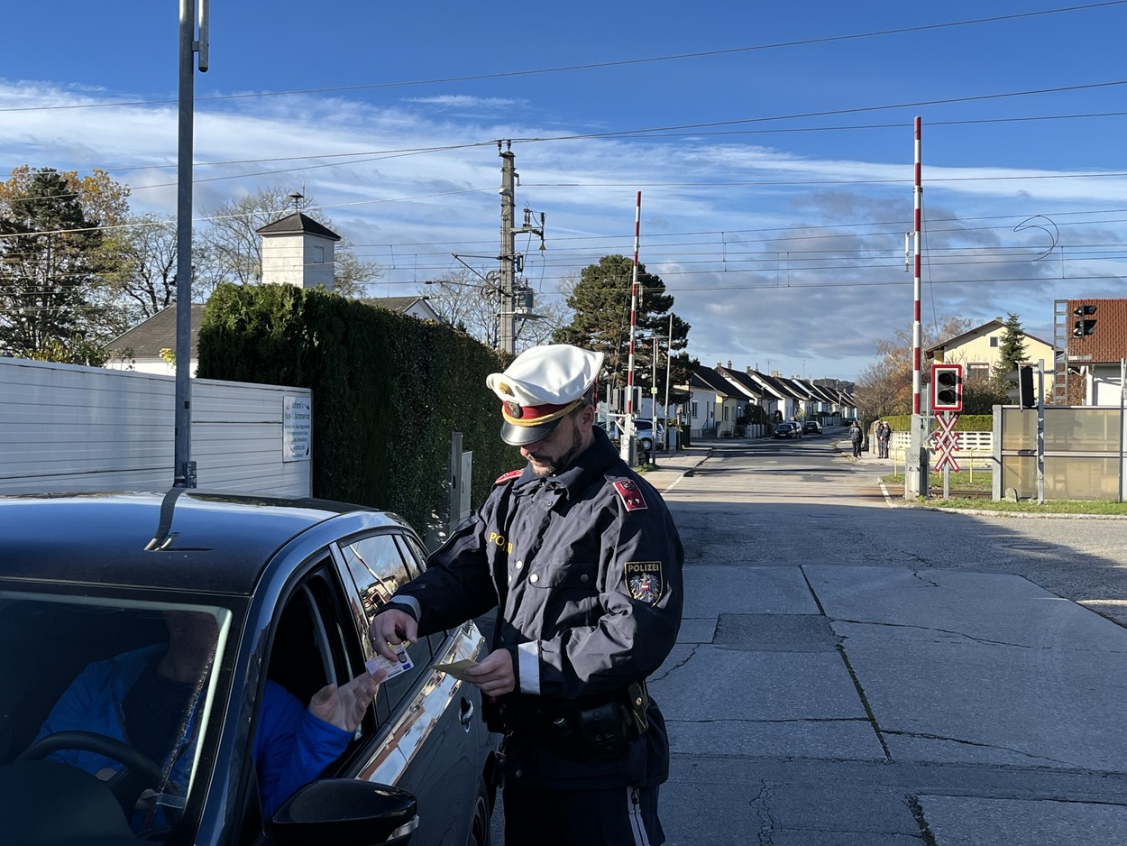 Statt einem erhobenen Zeigefinger hat es heute an mehreren Eisenbahnkreuzungen in Niederösterreich ein großes DANKE in Form von Dankesmandaten an jene Straßenverkehrsteilnehmer:innen gegeben, die sich beim Queren einer Eisenbahnkreuzung richtig verhalten und die Verkehrsregeln befolgt haben und kein Risiko eingegangen sind. Zusätzlich wurden Folder verteilt, in denen das richtige Verhalten an Eisenbahnübergängen beschrieben wird.