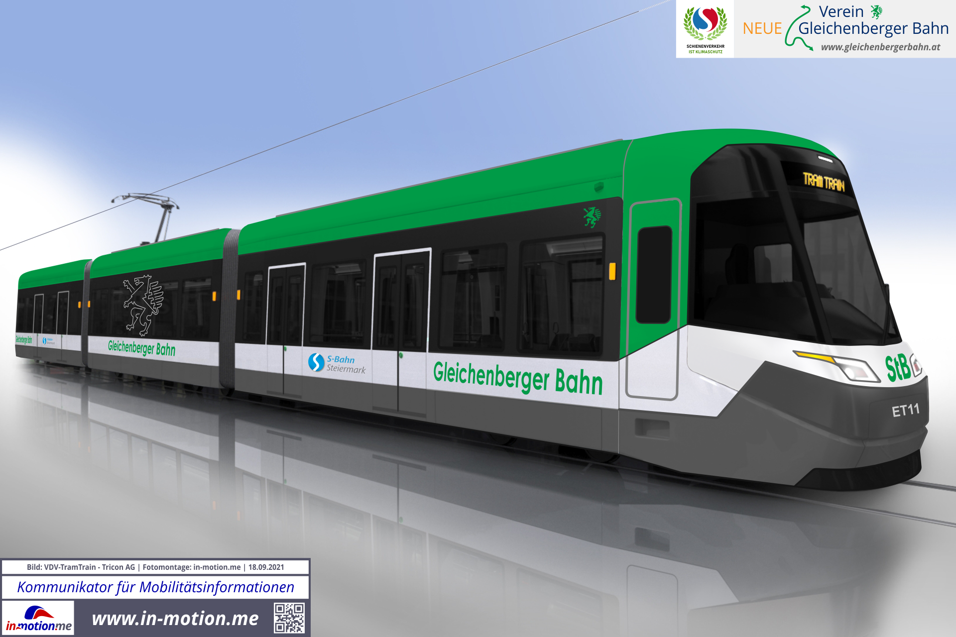 Für den Verein "Neue Gleichenberger Bahn" im Raum Südost-Steiermark wurde ein moderner VDV-Triebwagen im möglichen Design "Gleichenberger Bahn" gestaltet. Fotomontage: AIM; Originalbild: VDV-Pressebild