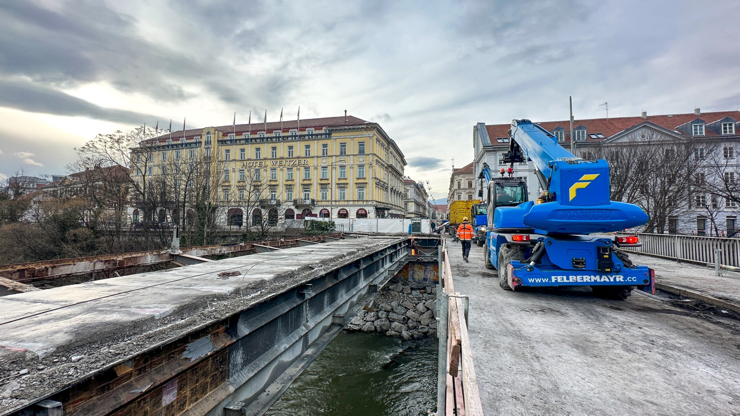 Für die sogenannte „statische Ertüchtigung“ der Brücke werken die Bauarbeiter:innen deshalb seit 8. Jänner auf Hochtouren: Der Asphalt wurde bereits abgefräst, Fahrbahnplatte und Kragarme werden in Teile geschnitten und abtransportiert.