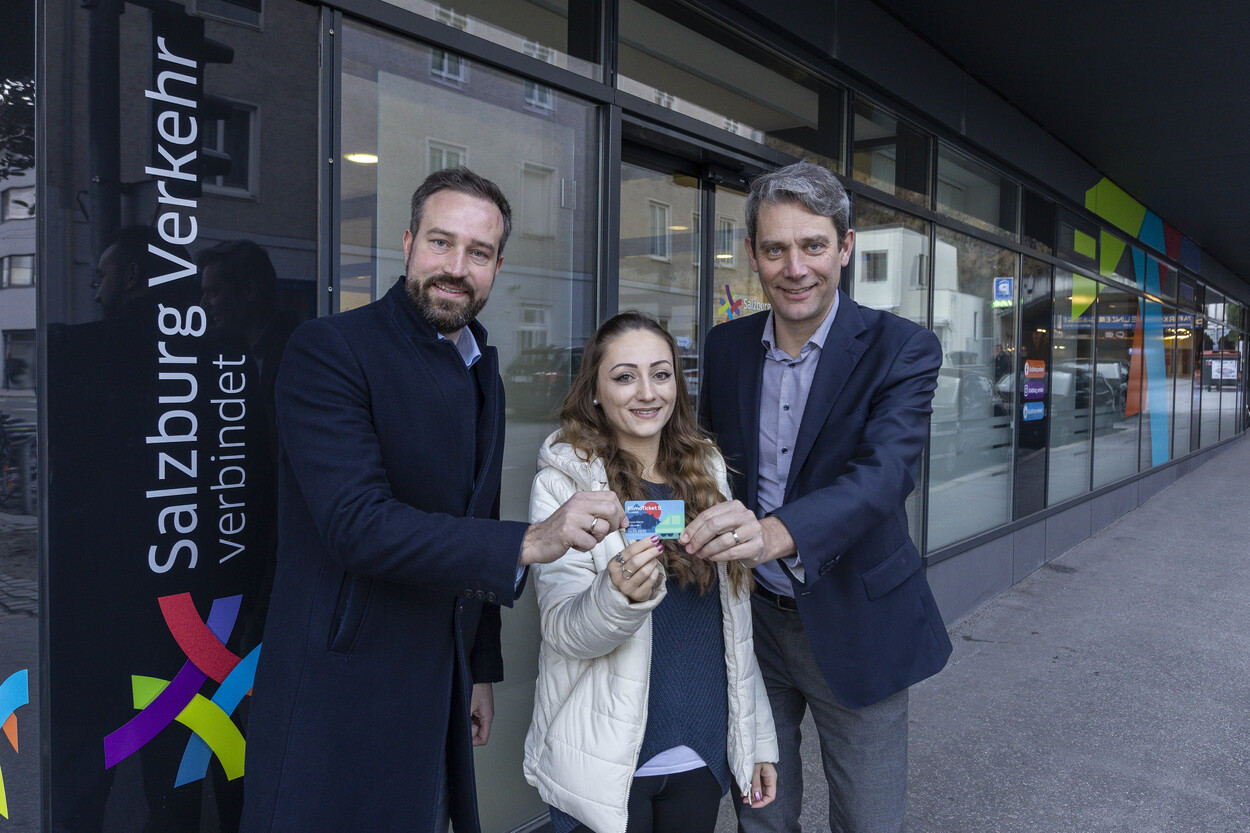 Landeshauptmann-Stellvertreter Stefan Schnöll und Salzburg Verkehr Geschäftsführer Johannes Gfrerer bedankten sich bei der hunderttausendsten Netzkarten-Kundin Tania Maria Schusser als Stellvertreterin für alle Kund:innen. Außerdem erhielt die 30-jährige Nutzerin der Netzkarte Nr. 100.000 ein kostenloses Ticket für ein Jahr. „Ich freue mich riesig über den Gewinn. Ich habe mir das Klimaticket Salzburg vor allem für meinen Arbeitsweg bestellt – ich hätte nie gedacht, dass ich dabei was gewinne. Es ist super, dass wir so einen Rekord geknackt haben“, so Tania Maria Schusser.