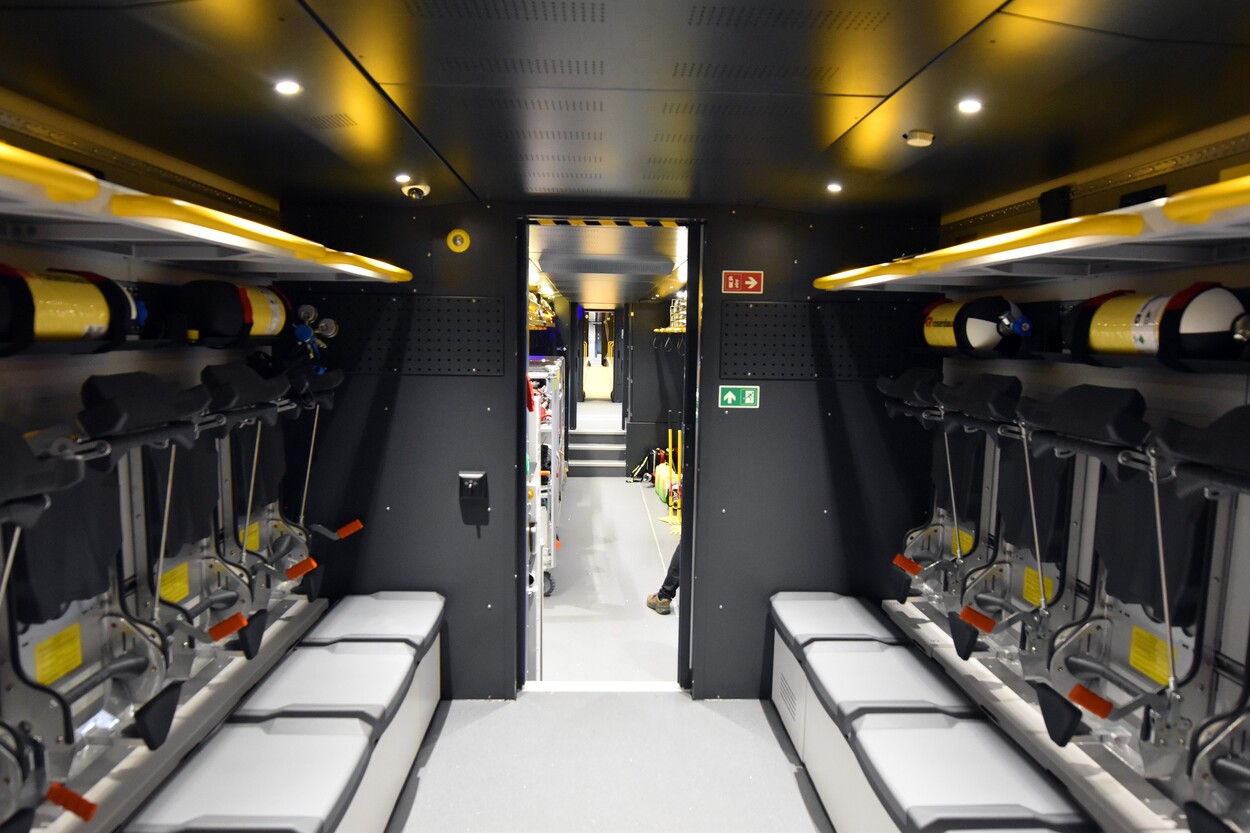 Der neue Stadler Rettungstriebzug ist ein einsatztaktisches Multitalent. Er muss für den Worst Case, einen Lösch- und Rettungseinsatz in einem Eisenbahntunnel, gerüstet sein, nimmt bei Evakuierungen die Fahrgäste aus anderen Zügen auf und wird auch für Instandhaltungsarbeiten genutzt. Im Notfall finden über 300 Menschen in den drei durchgängig von vorne bis hinten begehbaren Waggons Platz. 18 Sitzplätze sind mit Pressluftatmer-Halterungen für Feuerwehrmitglieder ausgestattet. Eine Klimaanlage mit Spezialfiltern schützt die Menschen im Zug vor Rauchgasen. Ausserdem ist die gesamte Zuggarnitur druckertüchtigt, so dass der Innenraum auf einem leichten Überdruck zur Rauchfreihaltung in Tunneln gehalten werden kann. Der vordere Teil des Zuges mit dem Führerstand kann von aussen durch eine Wassersprühanlage geschützt werden.