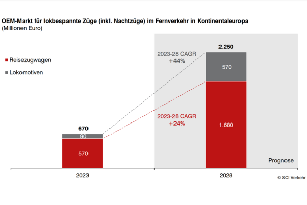 SCI Verkehr zeigt in einer neuen Studie, dass ein Nachfrageboom nach flexiblen Fahrzeugkonzepten in Europa eingesetzt hat und erwartet zwischen 2023 und 2028 ein jährliches Wachstum von rund 30%. Mit der Wiederbelebung lokbespannter Züge in moderner Wagenausstattung ergeben sich universeller einsetzbare Lösungen auf der Fahrzeugseite, welche dem Wettbewerb im Fernverkehr die entscheidende Hürde nehmen. Dies gilt insbesondere auf grenzüberschreitende Relation, weil die Zulassung der Wagen und der Lokomotive einzeln deutlich weniger aufwändig ist als die eines Hochgeschwindigkeitstriebzugs. Die starke Nachfrage nach diesen Zügen macht deutlich, dass neue Anbieter auf die Fernverkehrsmärkte drängen – sei es frontal im Wettbewerb auf attraktiven Linien der Staatsbahnen oder grenzüberschreitend in Randlagen im Tages- und Nachtzugverkehr so ein Ergebnis der Marktstudie „Intercity and Night Trains - European Market Trends 2024“.