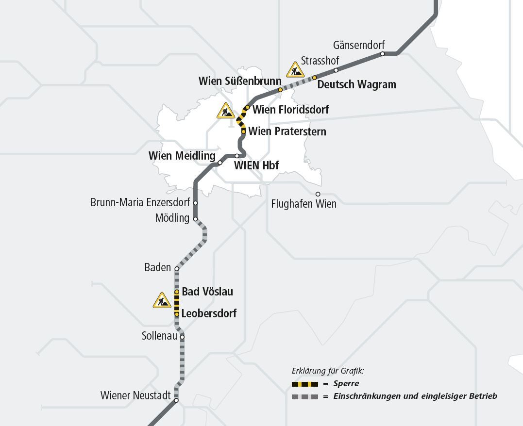 Um Fahrgäste auch in Zukunft zuverlässig und komfortabel an ihr Ziel zu bringen, modernisieren die ÖBB zahlreiche Strecken und bautechnischen Anlagen in der Ostregion bis Ende 2027 umfassend. Die notwendigen Bauarbeiten finden besonders in den Sommermonaten statt, um frequenzschwächere Zeiten – bedingt durch Urlaub und Ferien – zu nutzen und möglichst wenige Fahrgäste in ihren täglichen Wegen zu beeinträchtigen. Im Zeitraum von 29. Juni bis 2. September 2024 gilt deshalb auf einigen Bahnstrecken in Wien und Niederösterreich ein neuer Fahrplan. Es werden zeitgleich drei Teilabschnitte der Nord-Süd-Achse (Nordbahn, S-Bahn Stammstrecke, Südstrecke) ganz oder teilweise gesperrt. Zwischen Wien Floridsdorf und Wien Praterstern fahren keine Züge. Außerdem ist die Südstrecke zwischen Leobersdorf und Bad Vöslau unterbrochen.
