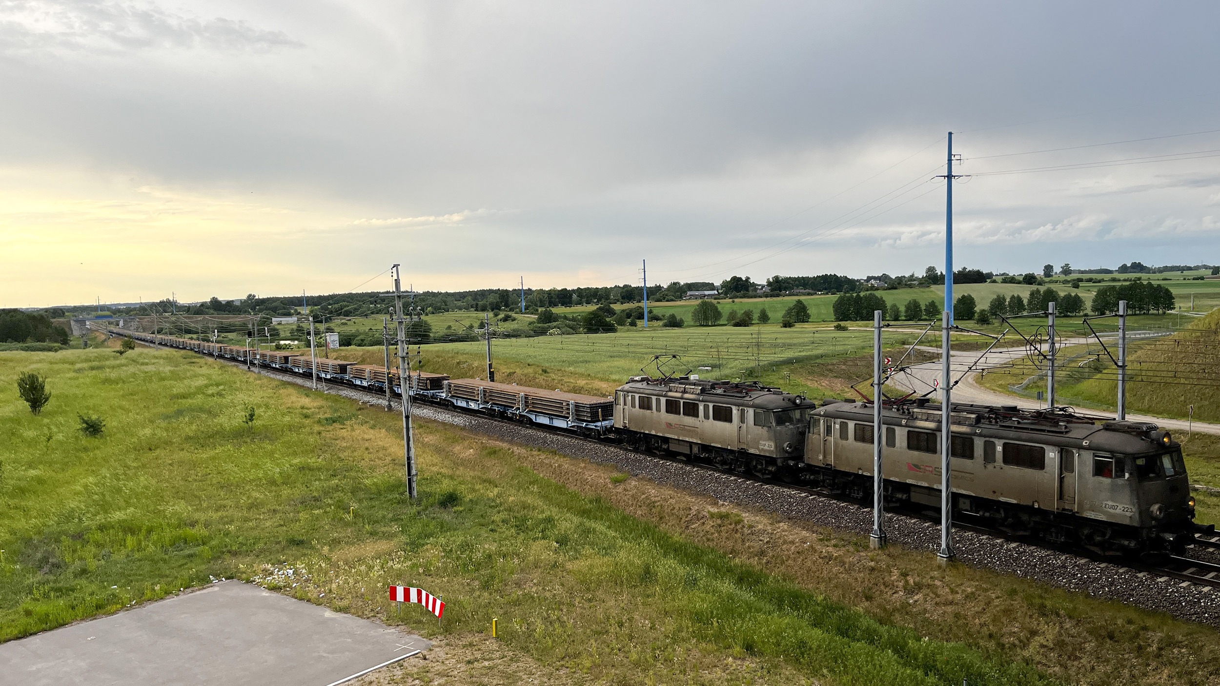 20 Stück 2x45 ft InnoWaggons, ausgestattet mit unserem Palettensystem, liefern Schienen durch Polen. Auf einem Waggon befinden sich 15 Schienen in einer Reihe, gestapelt in vier Lagen. Das heißt, auf einen 2x45 ft InnoWaggon passen 60 Stück der 25 Meter langen Gleise. Der Ganzzug ist ohne Lokomotive ca. 600 Meter lang und hat ein Gewicht (brutto) von 2.500 Tonnen. Das Palettensystem sichert die Gleise, ohne dass Gurte zur weiteren Sicherung der Ladung eingesetzt werden müssen. Mit unserer Lösung entfällt auch das Einölen der Ladeschwelle.