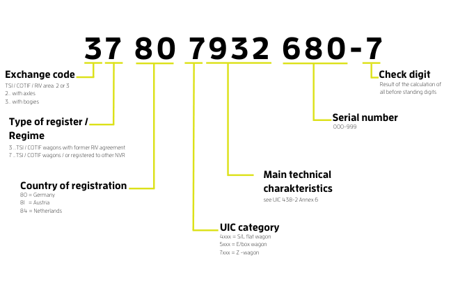 Unabhängig von der Art des Güterwagens befinden sich auf jeder Seite Aufkleber und Codes. Einer dieser Codes ist eine längere Nummer, die Wagennummer, genauer gesagt die Europäische Fahrzeugnummer (EVN).